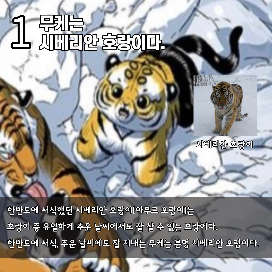 시베리아 호랑이는 아무르 호랑이라고도 불리며 다른 호랑이 종들 중에서도 가장 큰 편에 속합니다. 몸길이는 2.5-3m 정도 되며 몸무게는 평균 200-300kg이나 된다고 합니다. 서식지는 아무르 분지를 중심으로 한 시베리아 지역인데 과거에는 거의 동부 아시아 전역에 서식했을 정도로 개체 수가 많았으며 한반도 전역에서도 서식했을 정도로 우리 주변에 가까이 있었던 동물입니다. 다른 호랑이들과 다르게 추운 겨울 날씨에도 잘 지낼 수 있는 특징이 있습니다. 현재 무케는 한반도에 서식하고 있는 것으로 보이며 특히 추운 겨울 날씨에도 잘 지내는 것을 보면 시베리아 호랑이가 맞다고 생각됩니다.