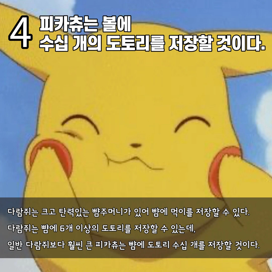 피카츄는 볼에 수십 개의 도토리를 저장할 수 있을 것이다.