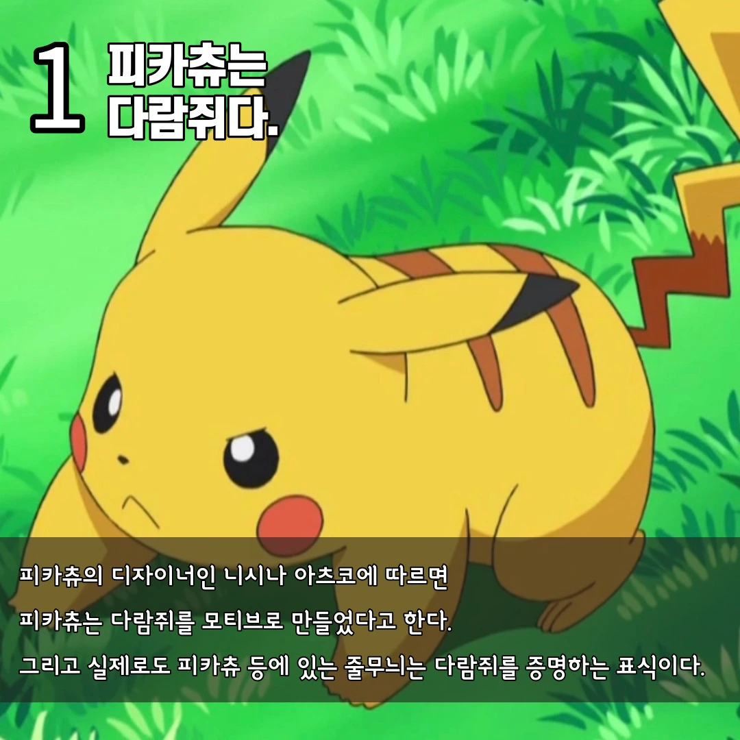 피카츄의 롤 모델이 되는 동물에는 여러 가지 설이 있었습니다. 친칠라라는 이야기부터 우는 토끼라는 설까지 여러 설이 있었지만, 피카츄를 만든 디자이너인 니시나 아츠코에 따르면 피카츄를 만들 때 다람쥐를 모티브로 삼았다고 합니다. 즉, 피카츄는 다람쥐라는 뜻입니다.