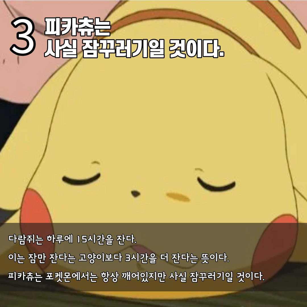 다람쥐는 일반적으로 주행성이지만 하루에 15시간을 잘 정도로 잠꾸러기입니다. 정말 잠만 자는 것 아니냐라고 의심하는 고양이도 하루에 12-13시간을 잔다고 하는데 다람쥐는 한술 더 뜨는 것 같습니다. 다람쥐가 잠을 많이 자는 이유는 다람쥐는 평소 서식지에 천적이 워낙 많이 있기 때문에 이들에게 눈에 띄지 않고 먹이를 먹기 위해 평소에 부지런하게 먹을 것을 집에 저장하기 때문입니다. 또한 상당히 긴 기간 동안 겨울잠을 자야 하기 때문에 겨울을 나기 위한 먹이를 부지런히 저장해야 하는데 그 때문에 활동량이 많고 에너지 소비량이 많아 잠을 많이 자는 것으로 추측합니다. 다람쥐인 피카츄 역시 비록 포켓몬에서는 항상 깨어있는 모습을 보여주지만 사실 잠이 아주 많은 잠꾸러기일 것입니다.