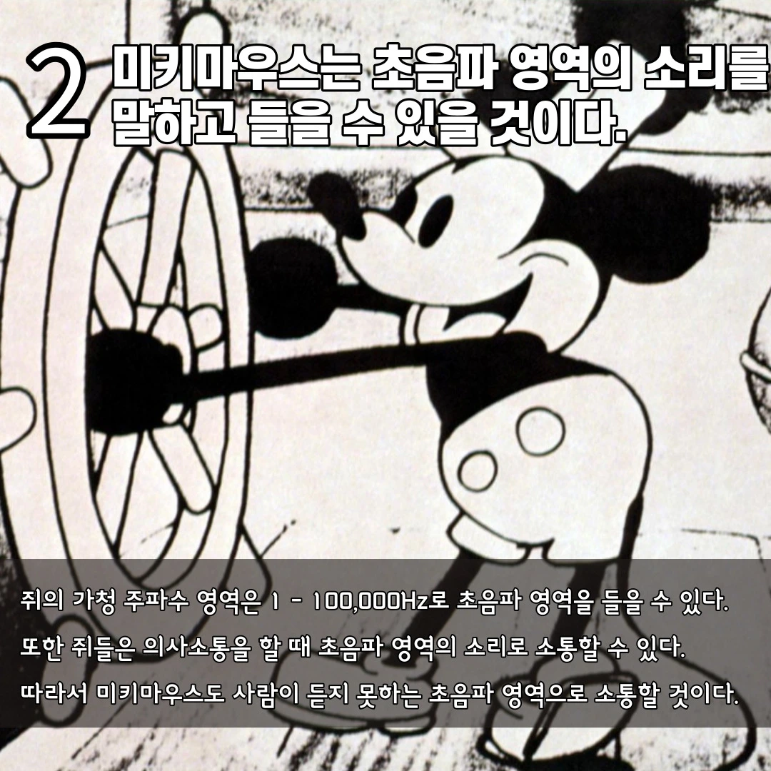 미키마우스 역시 사람은 내지 못하는 초음파 소리를 통해서 다른 쥐들과 소통할 수 있을 것으로 예상되는데요. 만약 미키마우스가 입만 뻐끔거리고 소리가 들리지 않는다면 초음파로 다른 쥐들과 이야기하는 것일 수도 있겠습니다.
