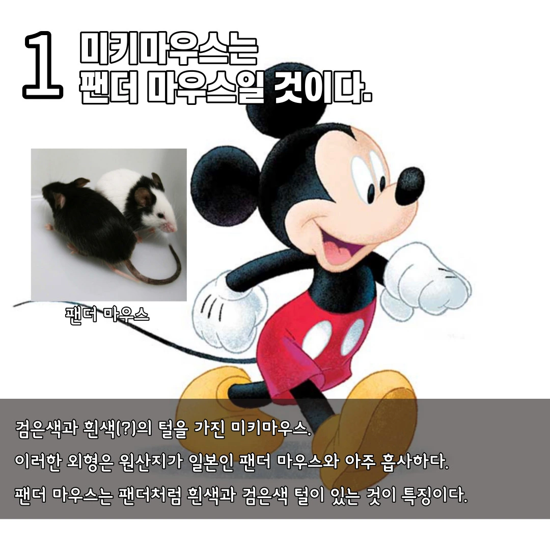 미키마우스의 외형적인 특징은 검은색과 흰색의 털을 가지고 있으며 귀가 아주 크고 코가 튀어나와 있습니다. 또한 이족보행이 특징적이죠. 하지만 다른 건 다 제쳐두고 털의 색만 가지고 분석해보면 이 마우스와 가장 유사할 것 같습니다. 바로 흰색과 검은색 털을 가진 팬더 마우스입니다.