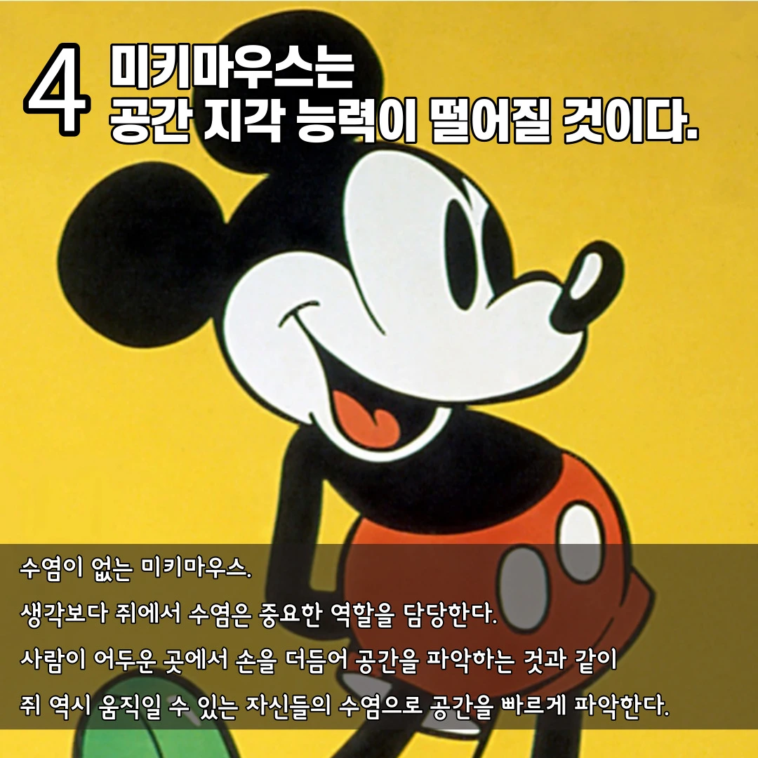하지만, 위대한 월트 디즈니도 미키마우스에 미처 수염을 넣지 못했습니다. (넣었다면 귀여움이 반감되어 지금의 디즈니가 탄생하지 못했을 것 같습니다.) 때문에 미키마우스는 다른 팬더마우스들보다 공간 지각 능력이 훨씬 떨어지고 사물을 인지하는 감각이 떨어질 것으로 추측됩니다. 미키마우스가 살아가는 데는 문제가 없겠지만 야생에서 다른 쥐들과 생존경쟁을 해야 하는 상황이라면 상당히 불리할 것으로 예상할 수 있습니다. 미키마우스는 생존을 위해 좋은 주인을 만나는 것이 가장 중요하겠군요.
