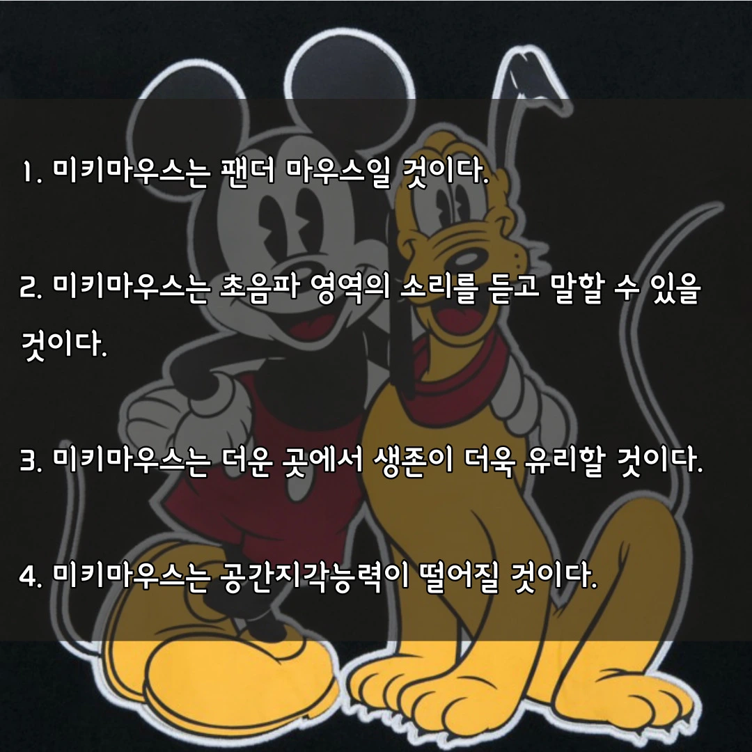 지구 온난화가 가속화되면서 포유류의 생김새 역시 변하고 있다고 합니다. 이러한 생김새 변화는 열 발산을 증가시키는 쪽으로 변화가 일어나고 있다고 합니다. 그 변화 중 하나는 바로 귀가 커지는 것인데요. 귀가 커진다는 것은 열 발산을 증가시켜 체온을 효과적으로 낮출 수 있다는 뜻입니다. 이 사실을 기억해두시고, 미키마우스의 외형을 봅시다. 미키마우스는 다른 팬더 마우스들에 비해서 상당히 큰 귀를 가지고 있는데요. 덕분에 열을 발산하여 체온을 낮추는 데는 다른 팬더 마우스보다 훨씬 유리할 것입니다.
