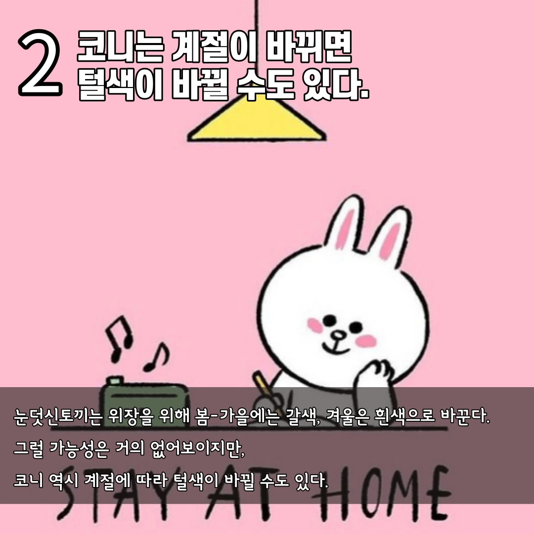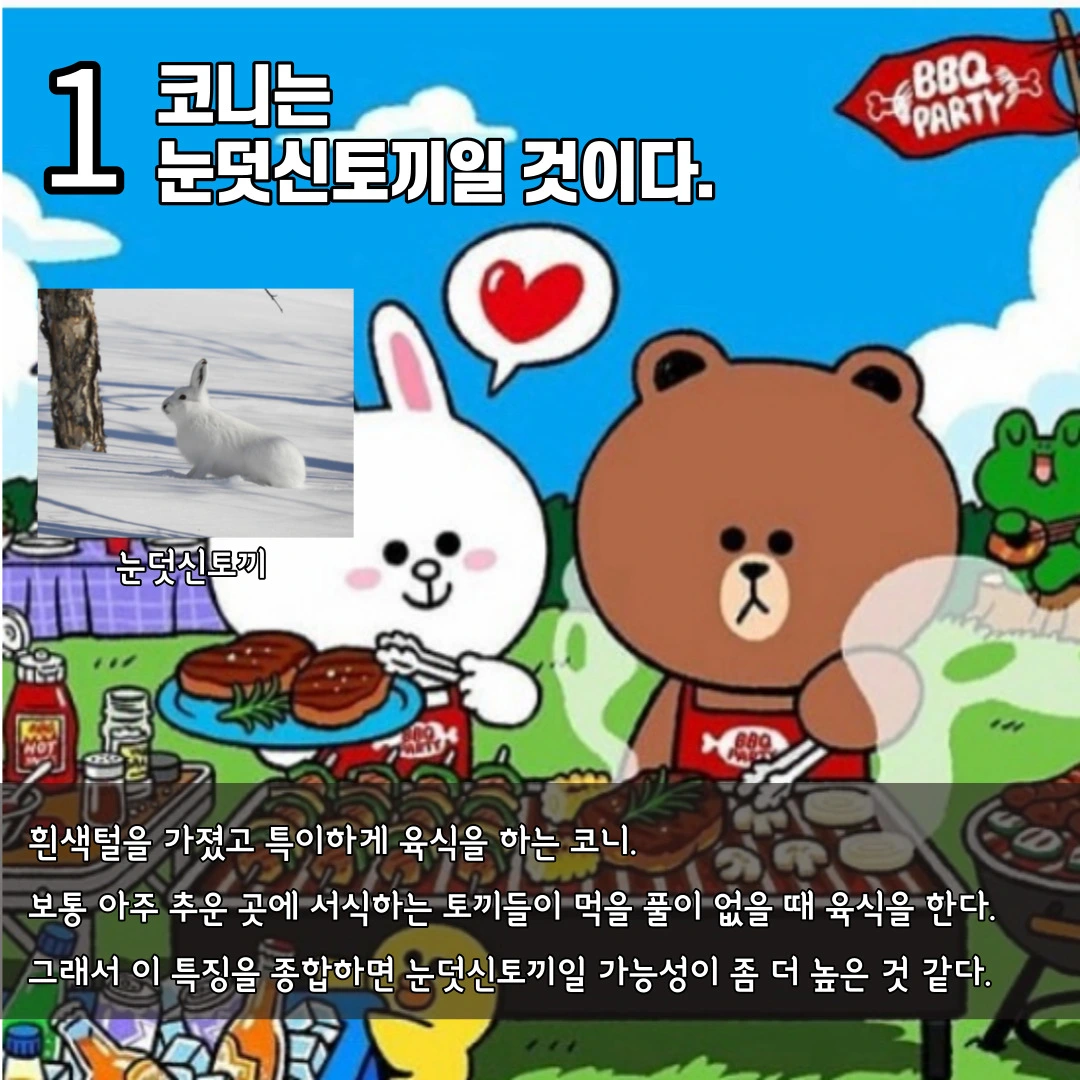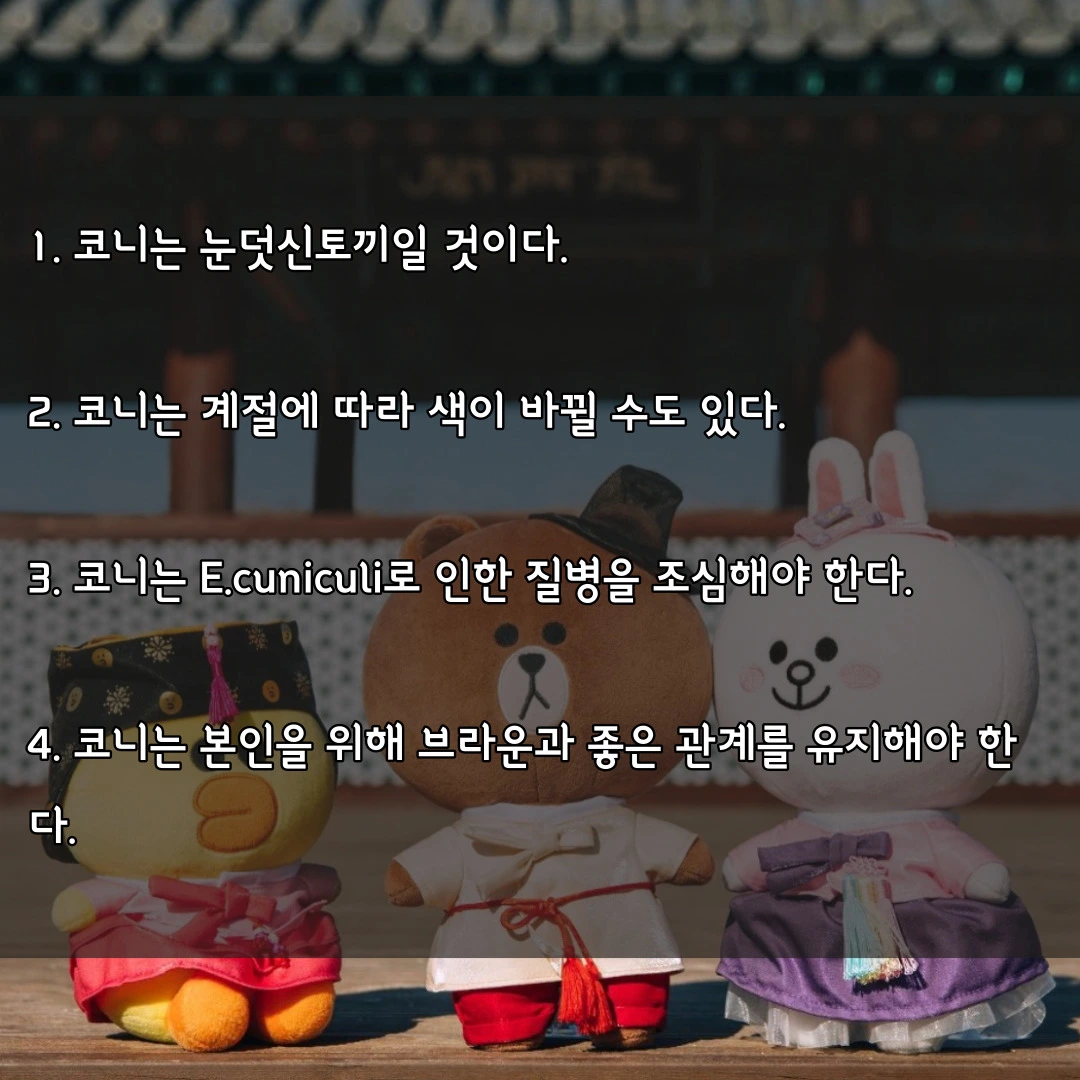 지금까지 라인프렌즈 코니에 대해 알아보았습니다. 코니는 눈덧신토끼로 추정되며 그로 인해 계절에 따라 털색이 바뀔 수도 있으며 E.cuniculi라는 원충성 질병에 조심해야 하며 본인의 안전을 위해서라도 브라운과 좋은 관계를 유지해야 하는 것이 제 결론이었습니다. 참고로 눈덧신토끼는 현재 멸종 위기라고 알려져 있습니다. 아마 지구 온난화로 인해 본인의 삶의 터전이 없어지기 때문일 것으로 추측하는데요. 우리 인류가 환경에 관심을 가져 코니의 친구들이 무사히 지구에서 살아가길 도와주어야 할 것입니다.