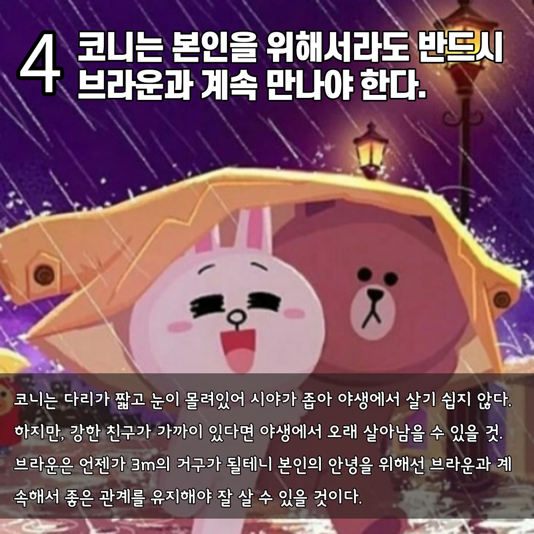 브라운은 불곰으로 추정되는데요. 불곰은 크기만 2m 이상에 무게는 300kg가 넘는 매우 육중한 덩치를 가지는 동물로 지상에 사는 육식동물 중에서 가장 강합니다. 비록 지금 브라운은 작고 귀여운 아기 곰일지 몰라도 성장하게 되면 코니와는 비교도 하지 못할 정도로 거대한 몸집을 가지게 될 것입니다. 그렇게 되면 코니의 포식자가 될 수 있는 어떤 동물도 브라운 때문에 접근할 수 없을 것입니다. 이러한 싹을 미리 알아본 코니는 본인의 안녕을 위해 브라운에게 미리 접근했을 것이고 브라운을 친구로 만들기 위해 노력했을 것입니다.