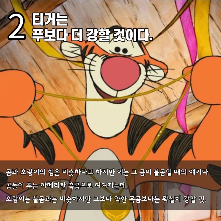 이때 곰돌이 푸는 아메리칸 흑곰의 아종인 커모드 베어로 추정되는데 만약 푸와 티거가 경쟁에 놓이게 된다면 티거가 조금 더 푸보다 강하지 않을까 추측해 봅니다.