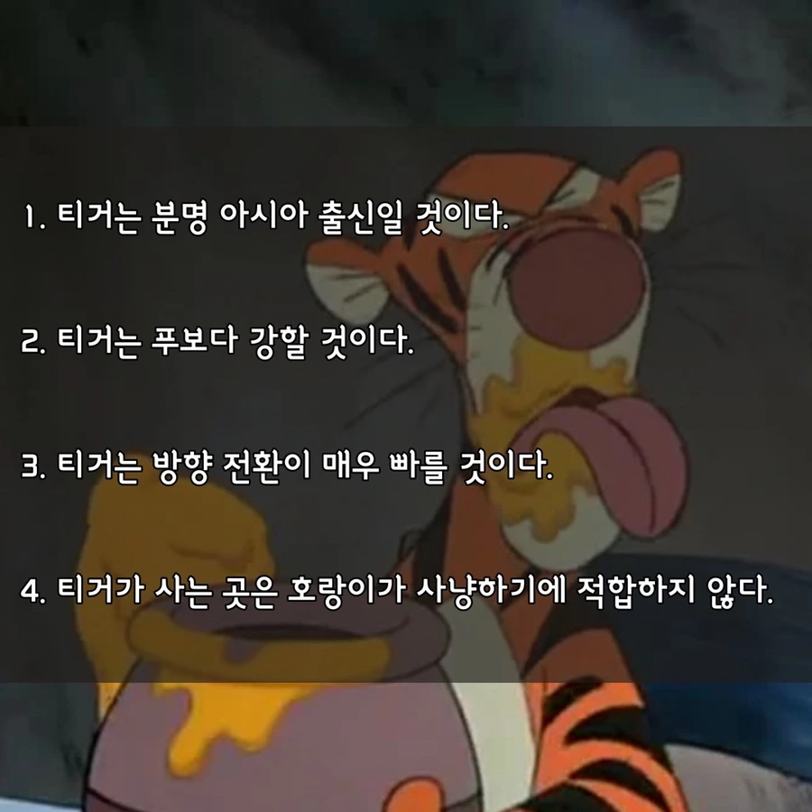 지금까지 티거에 대해서 분석하였습니다. 티거는 아시아 출신일 것이며 곰돌이 푸보다 강할 것이며 방향 전환과 균형 감각이 매우 뛰어나지만 티거가 사는 곳은 티거가 살기에는 적합하지 않다는 것이 제 결론이었습니다. 호랑이는 예전부터 인간에게 경외의 대상이었습니다. 그런 경외감은 남획을 초래하였고 호랑이는 비록 대중들에게는 매우 친숙한 동물로 알려져 있지만 사실상 멸종 위기에 봉착하였습니다. 아마 100년이 지나면 우리 지구상에서는 동물원을 제외한 곳에선 야생 호랑이를 더 이상 보지 못할 수도 있습니다. 더 이상의 호랑이 남획을 금지하고 최소한의 서식지를 국가 차원에서 보장해 주었으면 좋겠습니다.