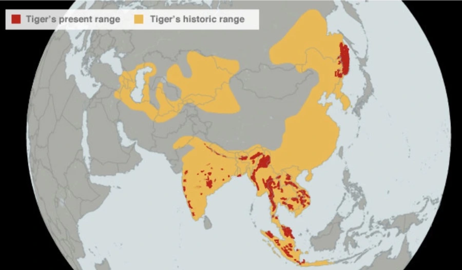 갑자기 곰돌이 푸가 사는 100에이커 숲에 들어와 눌러 앉은 티거. 사실 티거의 출신이 어딘지 정확하게 아는 사람은 거의 없습니다. 그러나 티거가 동물원 출신이 아니라는 가정하에 티거의 고향을 추적한다면 아시아 대륙에 한정되어 있을 것입니다. 호랑이는 예전부터 인도-인도차이나-중국-한국-연해주에 걸친 지역과 중앙아시아 일부에 살고 있었는데요. 그러나 최근 1990년에는 그 지역이 인도 일부, 인도차이나 일부, 연해주 일부에만 국한되어 있습니다. 그러나 예나 지금이나 호랑이가 아시아 지역에서만 산다는 것은 명확한 사실입니다.