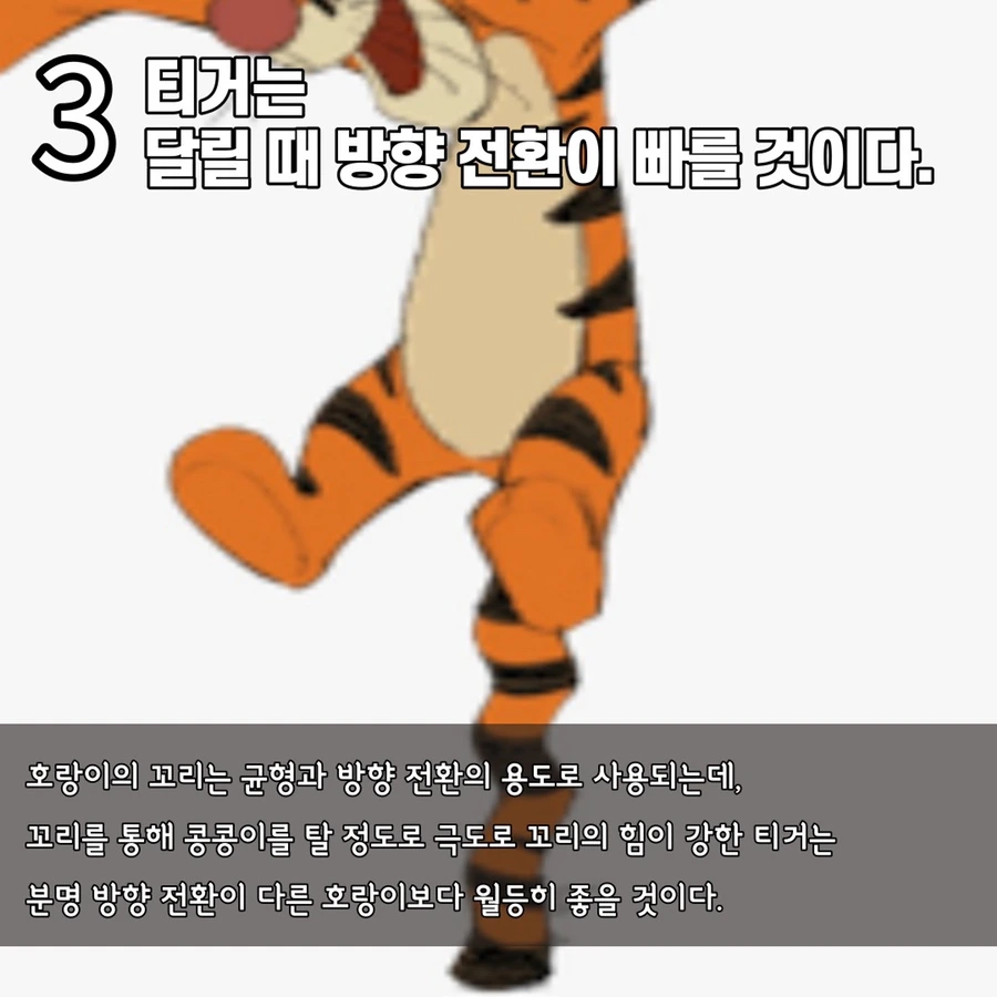 동물들은 일반적으로 긴 꼬리를 가졌습니다. 꼬리의 기능은 종마다 차이가 있을 수는 있지만 공통적으로 균형을 잡고 방향 전환을 도우는 역할을 합니다. 만약 꼬리의 힘이 강하고 탄력이 있다면 균형 감각과 방향 전환 능력이 뛰어나다고 볼 수 있습니다. 그런데 티거는 꼬리의 힘이 매우 강하게 묘사되어 있습니다. 호랑이는 성체 수컷 기준 최소 몸무게가 100kg이 넘는데 그 육중한 몸무게를 꼬리로 버티고 심지어 꼬리로 통통 뛰어다닐 만큼 그 힘이 강력합니다. 따라서 티거는 강력한 꼬리의 힘 덕분에 균형 감각이 매우 뛰어날 것이고 달릴 때 방향 전환 능력 역시 매우 뛰어날 것으로 추측합니다.