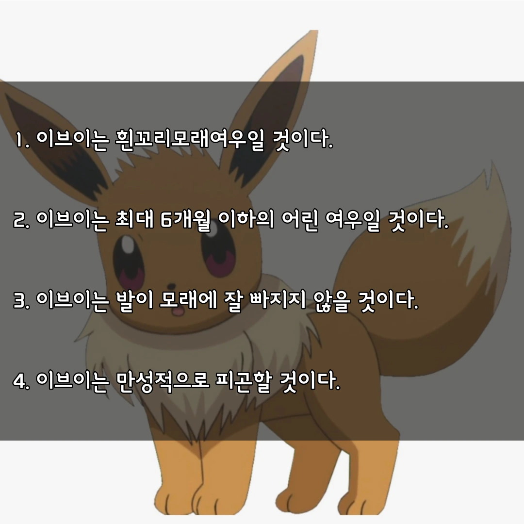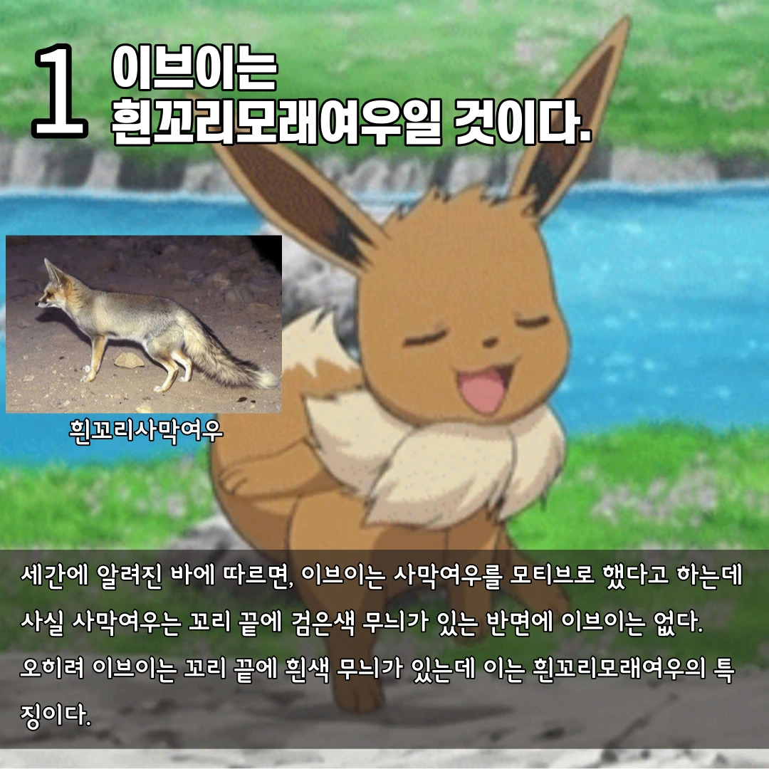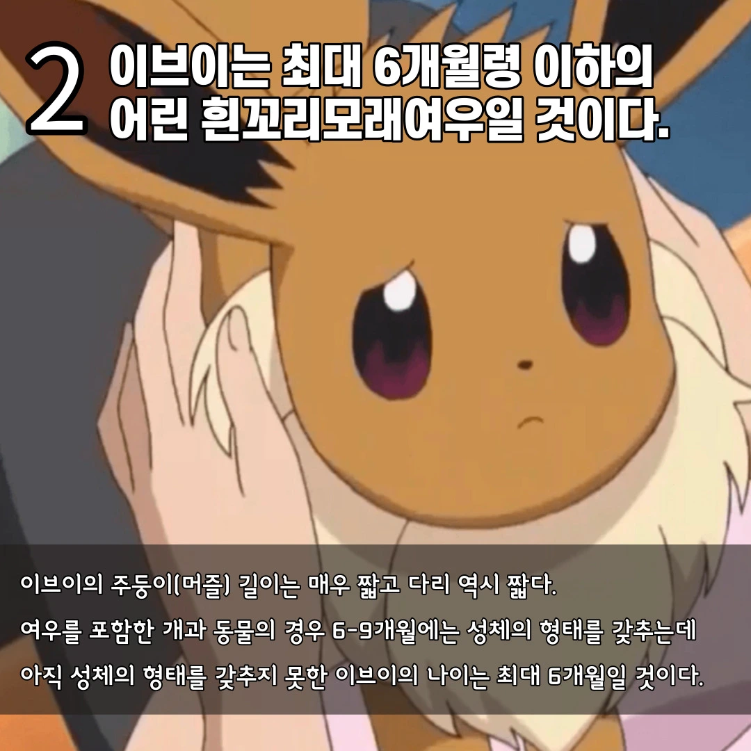 지금까지 이브이에 대해서 분석해 보았습니다. 이브이는 흰꼬리모래여우일 것이며 최대 6개월령 이하의 어린 여우로 발이 모래에 잘 빠지지는 않지만 만성적으로 피곤함을 겪고 있을 것이라는 게 제 결론이었습니다. 인지도로 따지면 피카츄 다음인 이브이. 앞으로도 이브이가 계속해서 사랑받았으면 좋겠습니다.