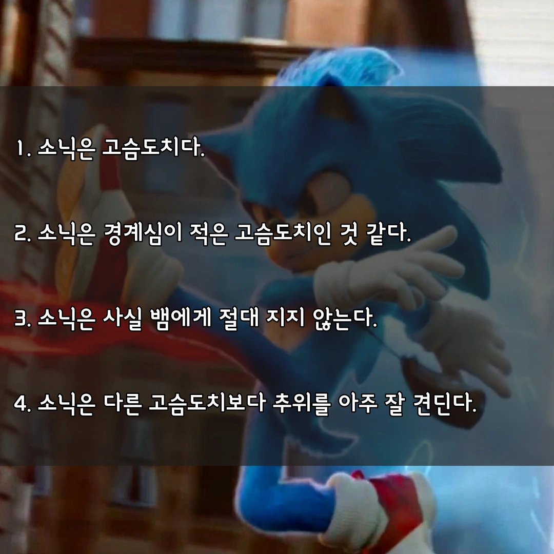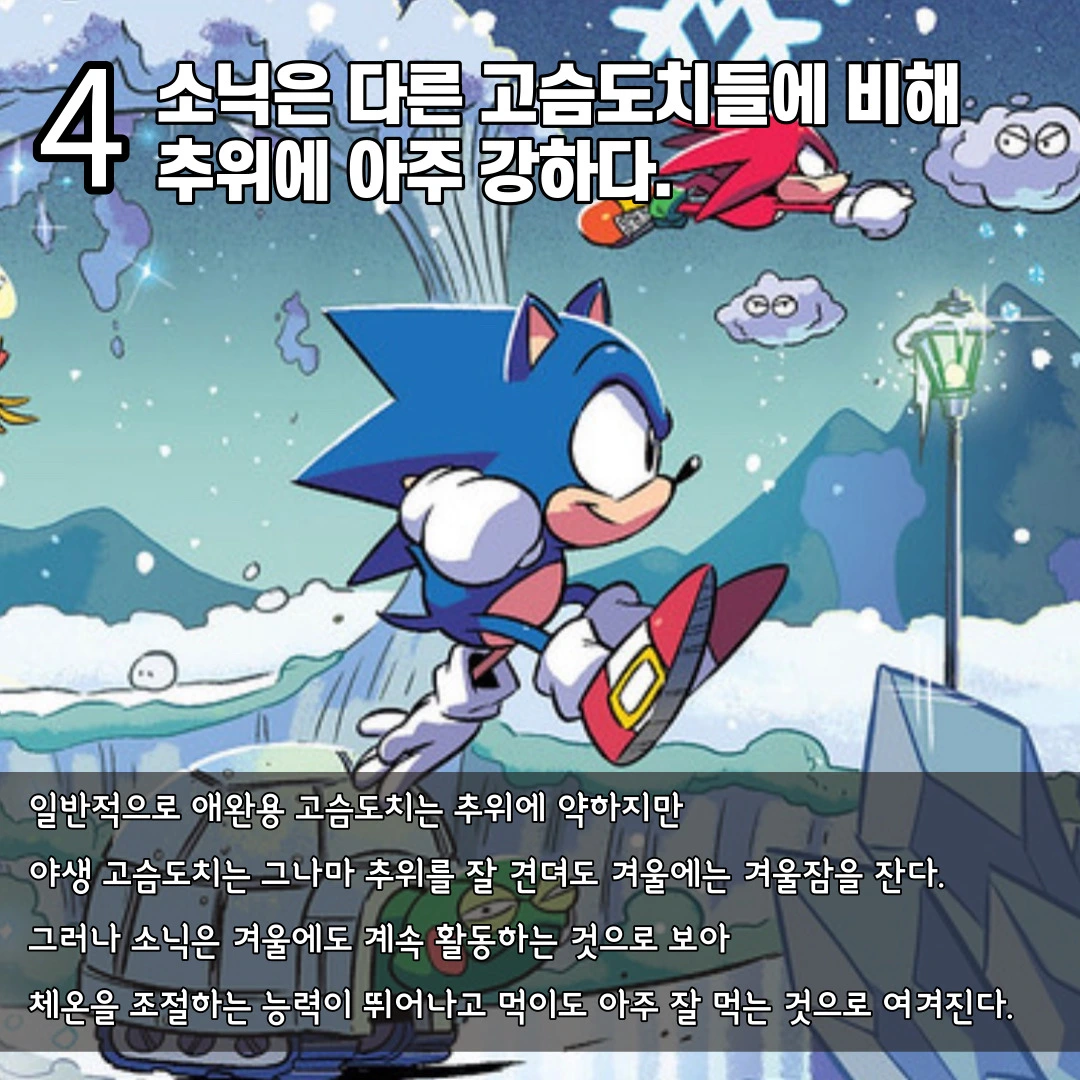 그럼에도 소닉은 한 겨울의 환경에서도 저렇게 잘 뛰어다니는 모습으로 보아 다른 고슴도치들보다 체온 조절 능력이 매우 뛰어나며 능력이 좋아 겨울에도 먹이도 풍부하게 잘 먹는 것으로 보입니다. 현실에서 소닉 같은 고슴도치가 있다면 뛰어난 적응력 때문에 그 고슴도치의 개체 수는 아주 빠르게 증가해서 우리 주변에서도 아주 쉽게 볼 수 있었을 것 같습니다.
