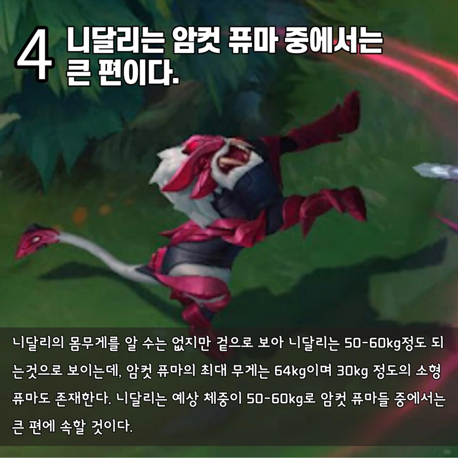 2010년대부터 지금까지 가장 인기 있는 게임을 꼽으면 아마 리그오브레전드를 꼽을 것입니다. 1990년대 후반에 등장한 스타크래프트를 뒤이어 우리나라에서 가장 인기 있는 게임으로 자리 잡은 리그오브레전드는 한때 많은 대학생들을 재수강과 유급의 늪으로 빠트렸던 게임이기도 한데요. 이번 포스팅에서는 리그오브레전드 챔피언 중 동물과 관련된 챔피언을 분석해 보고자 합니다. 소환사의 협곡에서 정글을 휘젓고 다니며 창으로 적을 꿰뚫고 다니는 챔피언인 니달리가 그 주인공인데요. 니달리라는 챔피언은 인간 형태의 모습도 있지만 쿠거 형태의 모습으로도 변신이 가능합니다. 과연 쿠거 형태의 니달리는 어떤 특징을 가진 동물일지 분석해 보겠습니다.