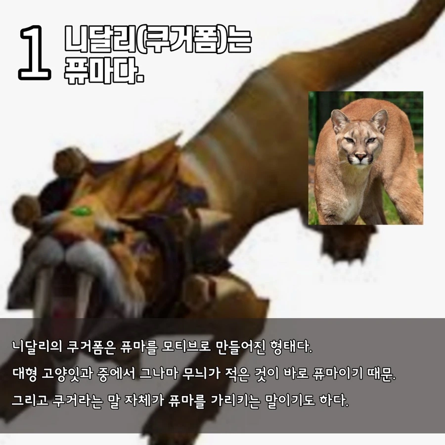니달리의 쿠거 형태는 대형 고양잇과 동물들과 매우 흡사한 유형을 가졌습니다. 고대의 동물까지 그 영역을 확대한다면 아주 큰 송곳니를 보아 스밀로돈과 가장 비슷해 보이는데요. 그 범위를 현대로 좁히면 가장 비슷해 보이는 동물은 바로 퓨마입니다. 퓨마는 다른 대형 고양잇과 동물들과는 달리 무늬가 거의 없고 귀가 약간 둥근 특징이 있습니다. 니달리의 쿠거폼은 무늬가 많지 않고 레오파드 특유의 무늬가 없어 그나마 퓨마와 가장 가까워 보입니다. 또한 쿠거라는 말 자체가 퓨마를 뜻하는 말이기도 하므로, 니달리는 퓨마라고 보입니다.
