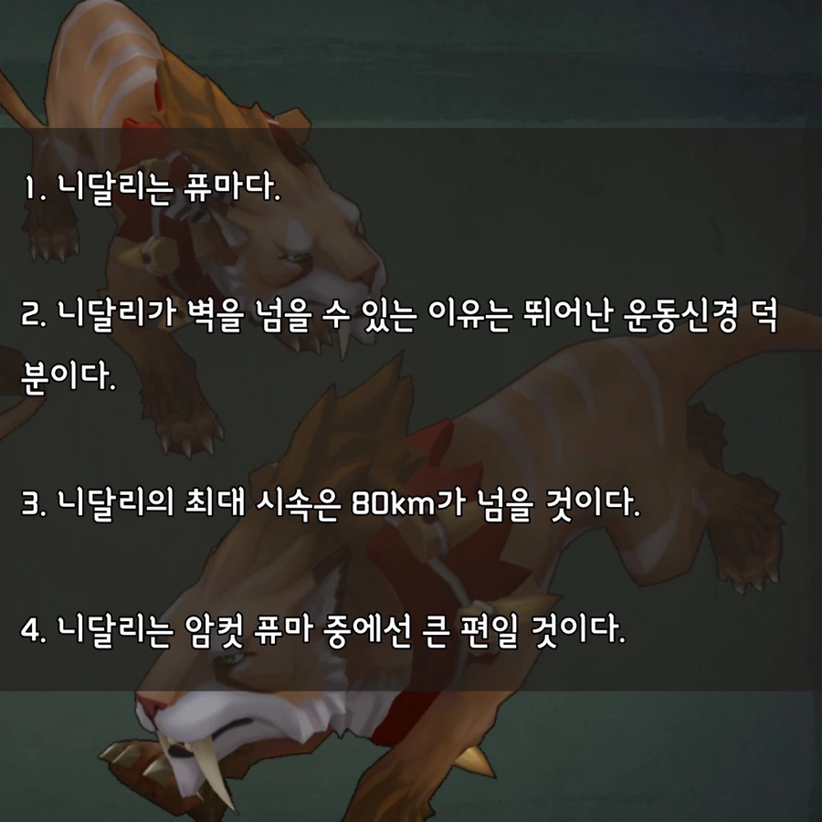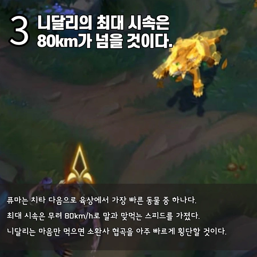 퓨마는 치타 다음으로 육상에서 가장 빠른 동물들 중 하나입니다. 치타의 시속이 비록 100km/h로 압도적이지만 퓨마는 그에 못지않은 80km/h로 말만큼이나 빠른 속력을 가진 동물입니다. 그러나 협곡에서 보여주는 니달리의 속도는 생각보다 매우 느린 것처럼 보이는데요. 니달리가 마음만 먹으면 소환사의 협곡을 매우 빨리 달릴 수 있을 것으로 생각되며 말과 관련된 챔피언인 헤카림만큼이나 빠르게 달릴 수 있을 것으로 생각됩니다.
