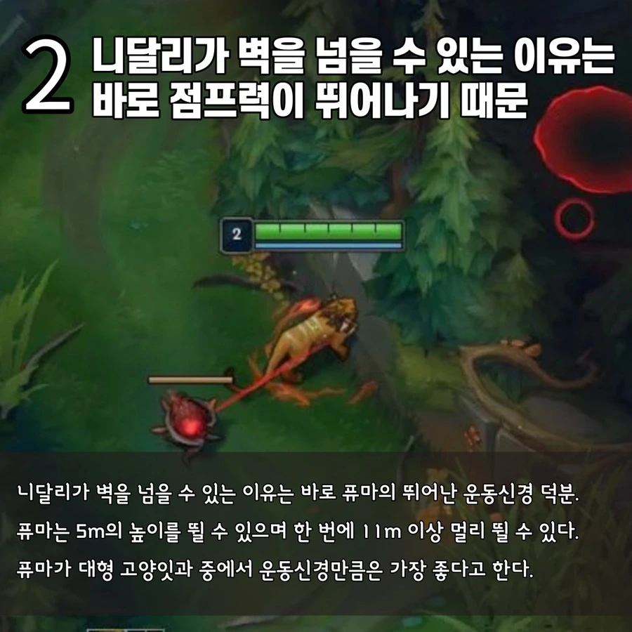 리그오브레전드의 소환사 협곡에는 굉장히 많은 벽들이 있습니다. 대부분의 챔피언들은 이 벽을 넘기 매우 힘들어하는데요. 니달리는 벽과 붙어있기만 하다면 이 높은 벽을 쉽게 뛰어넘을 수 있습니다. 그 이유는 퓨마 특유의 뛰어난 운동신경 덕분인데요. 퓨마는 높이뛰기로 5m에 이르며 멀리뛰기로는 11m가 가능하다고 합니다. 고양잇과 동물 중에서 가장 좋은 운동신경을 가졌다고 예상할 정도로 퓨마의 운동신경은 매우 좋습니다. 따라서 니달리가 소환사 협곡의 벽을 뛰어넘을 수 있는 이유는 퓨마 특유의 운동신경 덕분인 것으로 생각되며 벽이 10m가 넘을 경우에는 벽을 넘지 못할 것으로 추측됩니다.