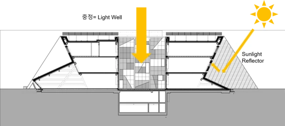 에너지드림센터 중앙에 중정이 설치되어 있다. 중정의 주 용도는 자연채광을 최대한 받아들이는 데에 있다. 중정의 설치로 인해 조명부하는 줄어들지만 냉난방 부하는 상승될 수 있다. 어떤 것이 적합한 선택인지는 에너지 시뮬레이션을 통해 판단해야 한다.