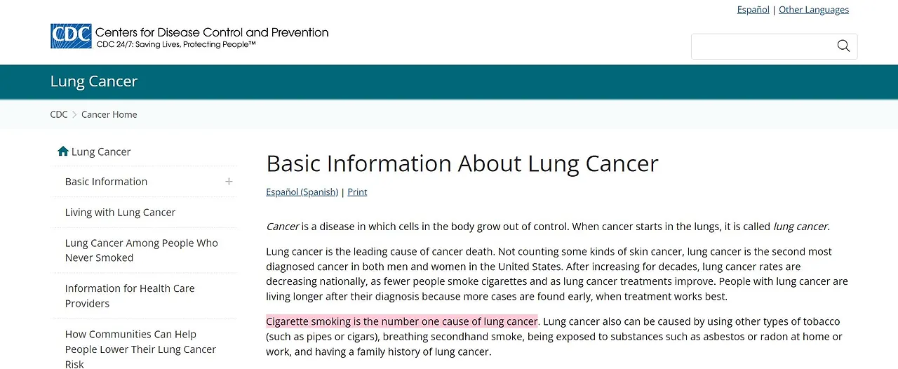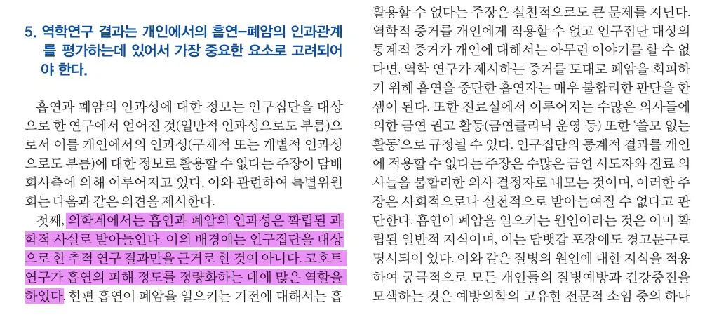 앞서 '~면...다'라는 언어적 형식은 인과관계뿐 아니라 상관관계도 전달한다고 했다. 그렇다면 댓글이 일리있는지 따지기 전에, '담배를 피우면 폐암 발생 위험이 커진다' 또는 '담배를 피우면 폐암이 생긴다'는 문장이 흡연-폐암 간의 상관관계를 전달하는 것인지, 더 나아가 인과관계를 전달하는 것인지부터 판단해야 한다. 흡연-폐암 간엔 인과관계가 성립한다는 게 현재 의학계 중론이다. 미국 질병예방통제센터(CDC)는 담배가 폐암을 유발하는 가장 큰 원인(분홍색)이라고 밝히고 있으며, 2015년 대한예방의학회·한국역학회 담배와 폐암 소송 관련 특별위원회가 '흡연과 폐암의 인과성에 대한 <대한예방의학회·한국역학회 담배와 폐암 소송 관련 특별위원회>의 의견'이라는 문서에 "의학계에서는 흡연과 폐암의 인과성은 확립된 과학적 사실로 받아들인다"라는 말을 명시하기도 했다.
