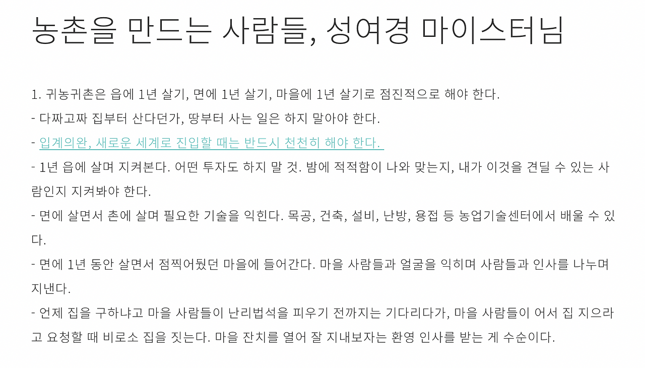 11. 1년간 시골에 정착하고 나서도 내 농장이 내 농장이 아니다. 내 일이 바쁘다고 이웃집 도와주는 일에 안 가면 화젯거리가 된다. 시골 가면 옆집사람하고 싸울 수도 있게 된단다. 어떤 사람이 좋은 사람인지, 어떤 사람이 쉽지 않은 사람인지 잘 파악할 것.