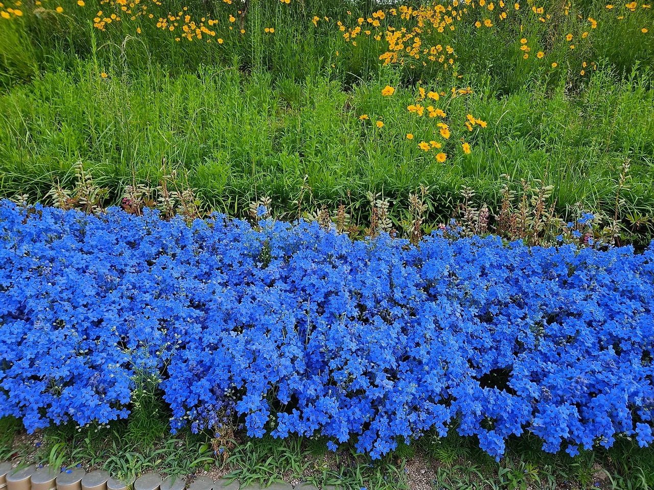 백합이 큰 키와 얼굴을 자랑하며 꽃대를 올리고, 벌개미취 보라가