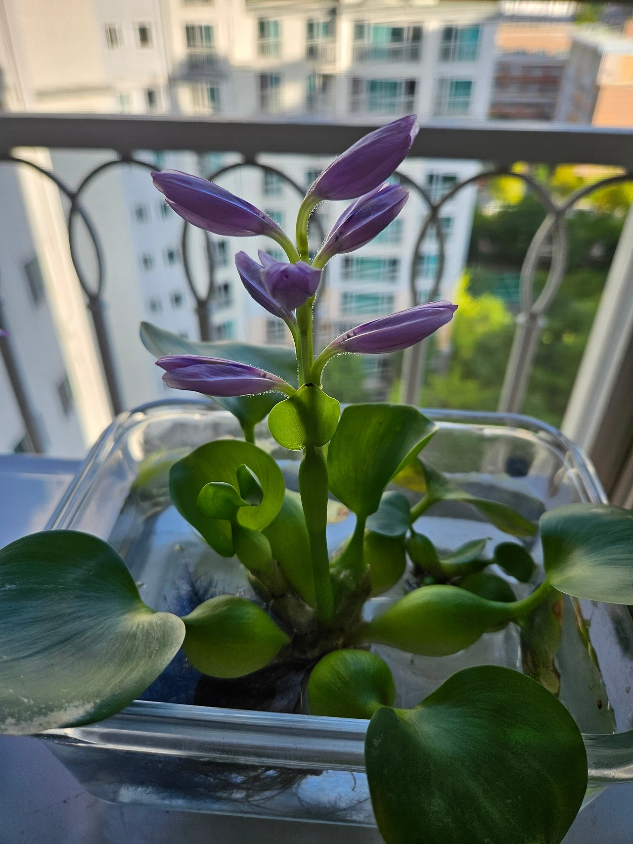 부레옥잠이 꽃대를 올리더니 꽃을 피웠어요.