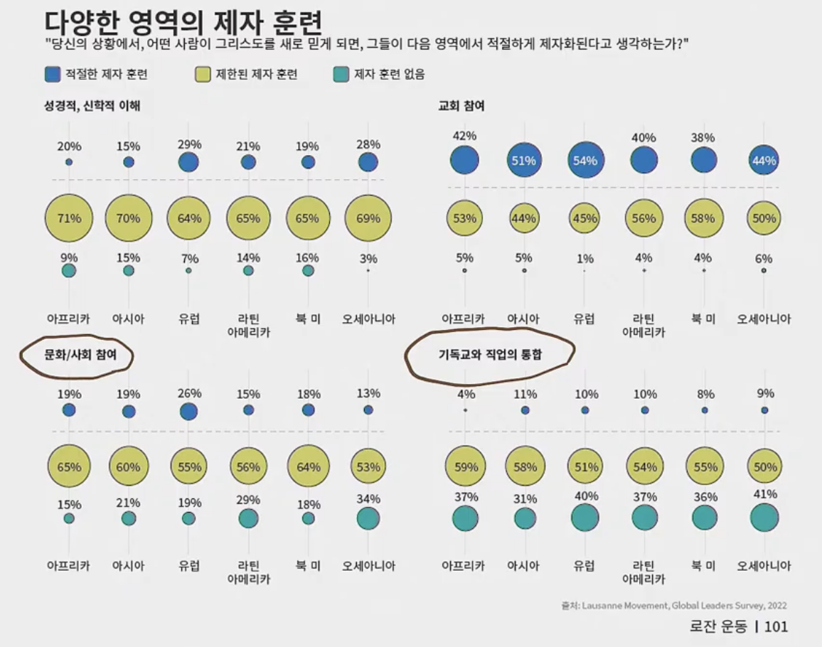 선교사님은 작년 나온 로잔의 세계선교보고서를 인용하며 삶의 현장에서 제자도가 이 시대에 얼마나 필요한 것인지를 말씀하셨다. 첫 번째 포인트는 문화사회참여, 믿음과 직업의 통합의 부분이 성경이해/교회참여에 비해 제자훈련이 훨씬 없는 영역이라는 아래 설문조사 결과이다. 두 번째 포인트는 사람들이 종교기관이나 국가보다 본인의 회사, 학교 등을 훨씬 더 신뢰한다는 조사결과이다.