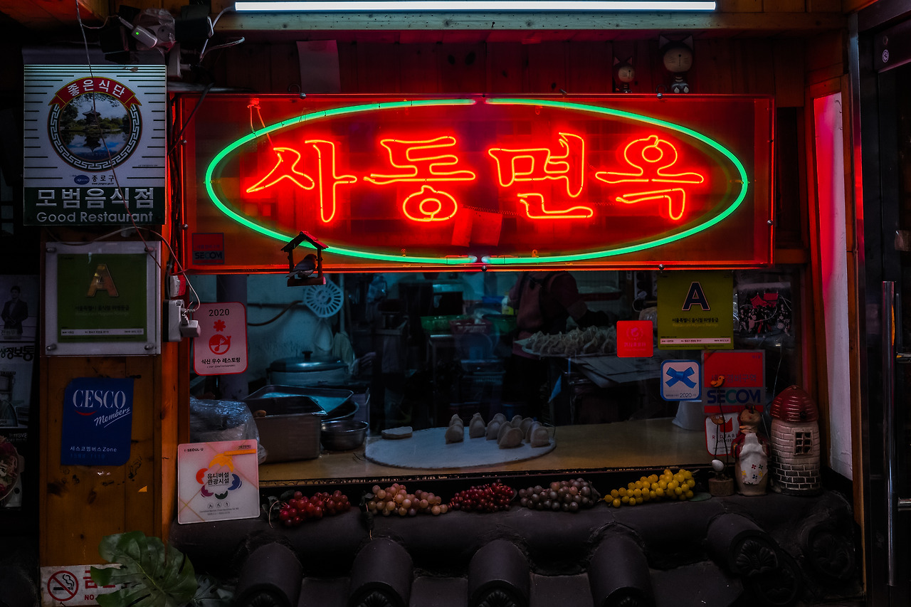 상점 네온사인에 주목하는 것도 흥미로운 접근이다. 사진은 빛과 그림자를 다루는 이미지 작업이기에, 우리 눈으로 봤을 때보다 사진에 담긴 네온사인이 때때로 더욱 근사하다. 이런 장면을 찍을 땐 명부가 날아가지 않도록 주의하고, 후보정 시 암부와 명부를 잘 조정해 자연스러운 결과물을 만들어야 한다.