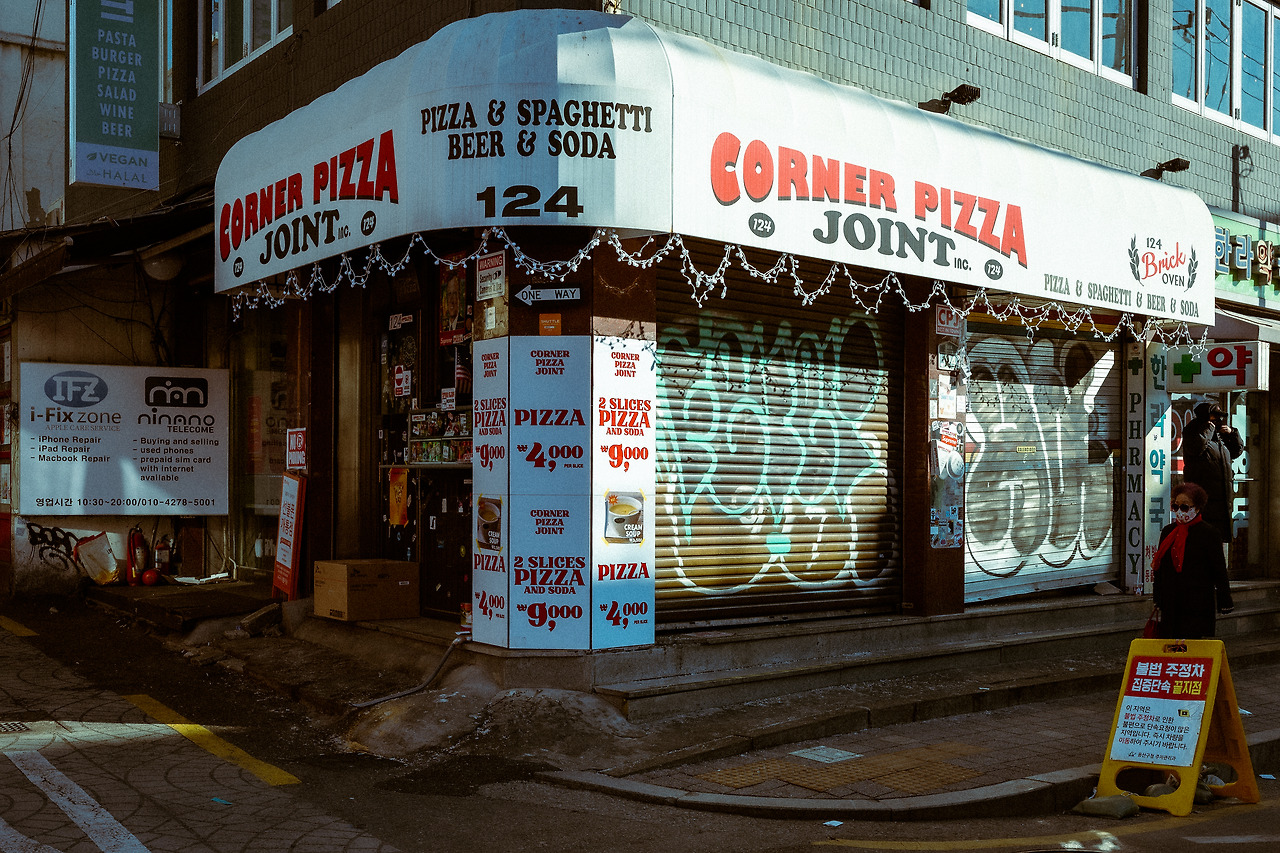 다양한 외국어가 뒤섞인 풍경. 한껏 멋을 낸 그래피티 셔터 도어에 오후에 햇살이 내려앉아 사진에 깊이감이 생겼다. 가장 이태원다운 사진 중 하나가 아닐까 싶다. 빛에 따라 다른 느낌을 자아내기 때문에 다시 찍더라도 거리 사진은 늘 다시 찍는 그 순간이 최초의 순간이다.
