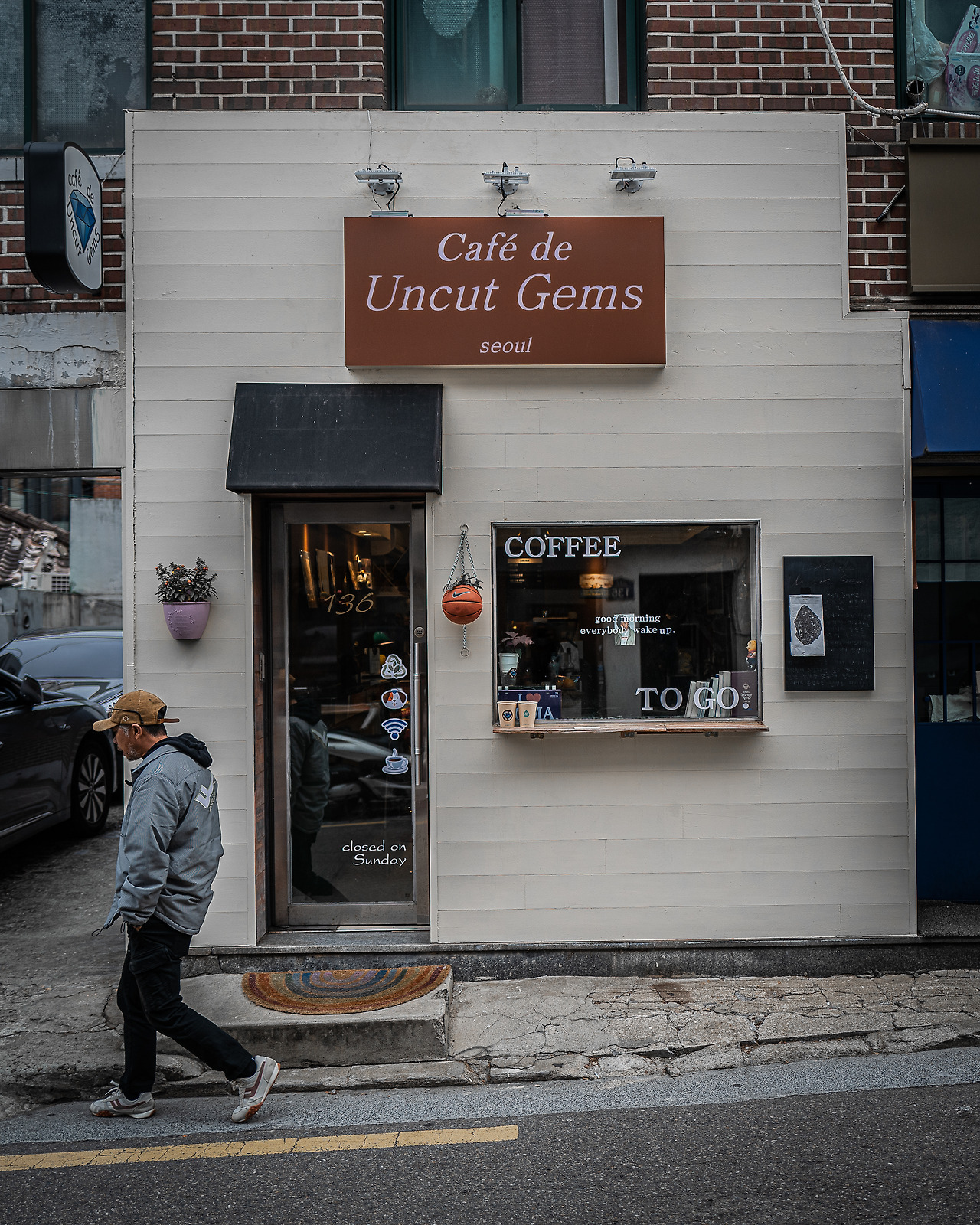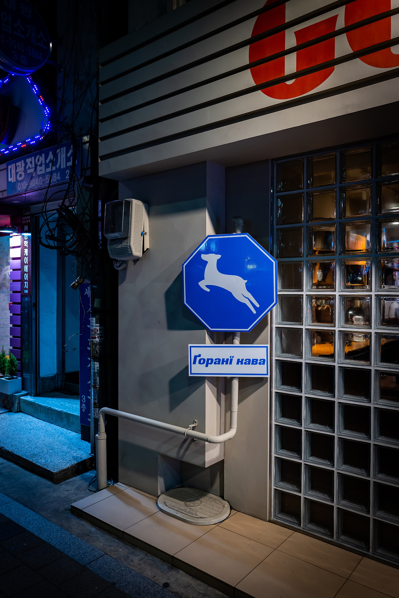 다양한 언어의 타이포그래피도 피사체로서 흥미롭지만, 상징과 그림에 주목하는 것도 재밌다. '고라니'라는 이름을 가진 카페. 익숙한 픽토그램 표지판에 고라니 그림이 그려져 있었다. 겨울에는 윈터 에디션인지 몰라도 산타 양말을 신은 고라니가 뛰어다니는 이미지로 바뀌기도 한다. 배색도 블루에서 그린으로 바뀐다.
