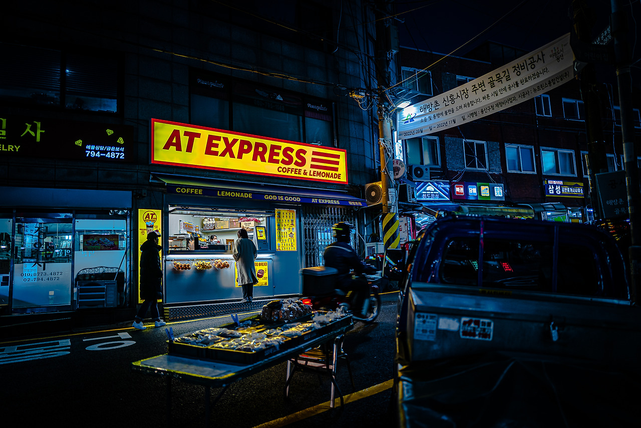 밤에 주변을 환하게 밝히는 가게들이 눈에 더욱 들어오는 순간이 있다. 심플하면서도 강렬한 타이포그래피로 해방촌오거리에서 한눈에 들어오는 AT EXPRESS.