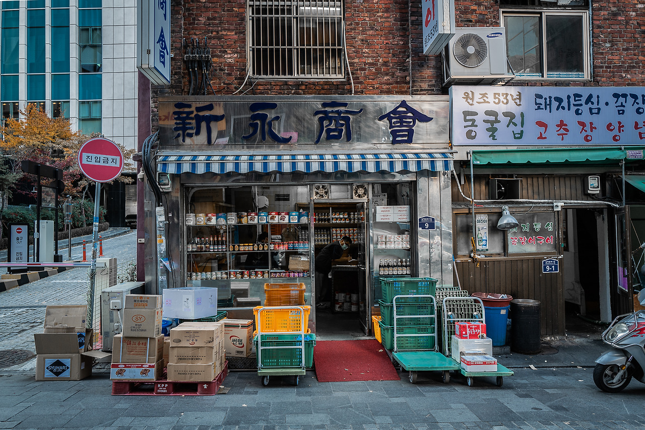 글로벌 도시 서울 거리에서는 이제 다양한 외국어들을 익숙하게 만나볼 수 있다. 사진을 통해 이국적인 느낌을 담고 싶은 사진가라면 거리 상점의 다양한 간판에 주목해 보자. 사진에 정답은 없지만, 가게 정면 사진을 찍을 때는 수직과 수평의 정확도를 고려하면서 촬영하는 것이 일반적이다.
