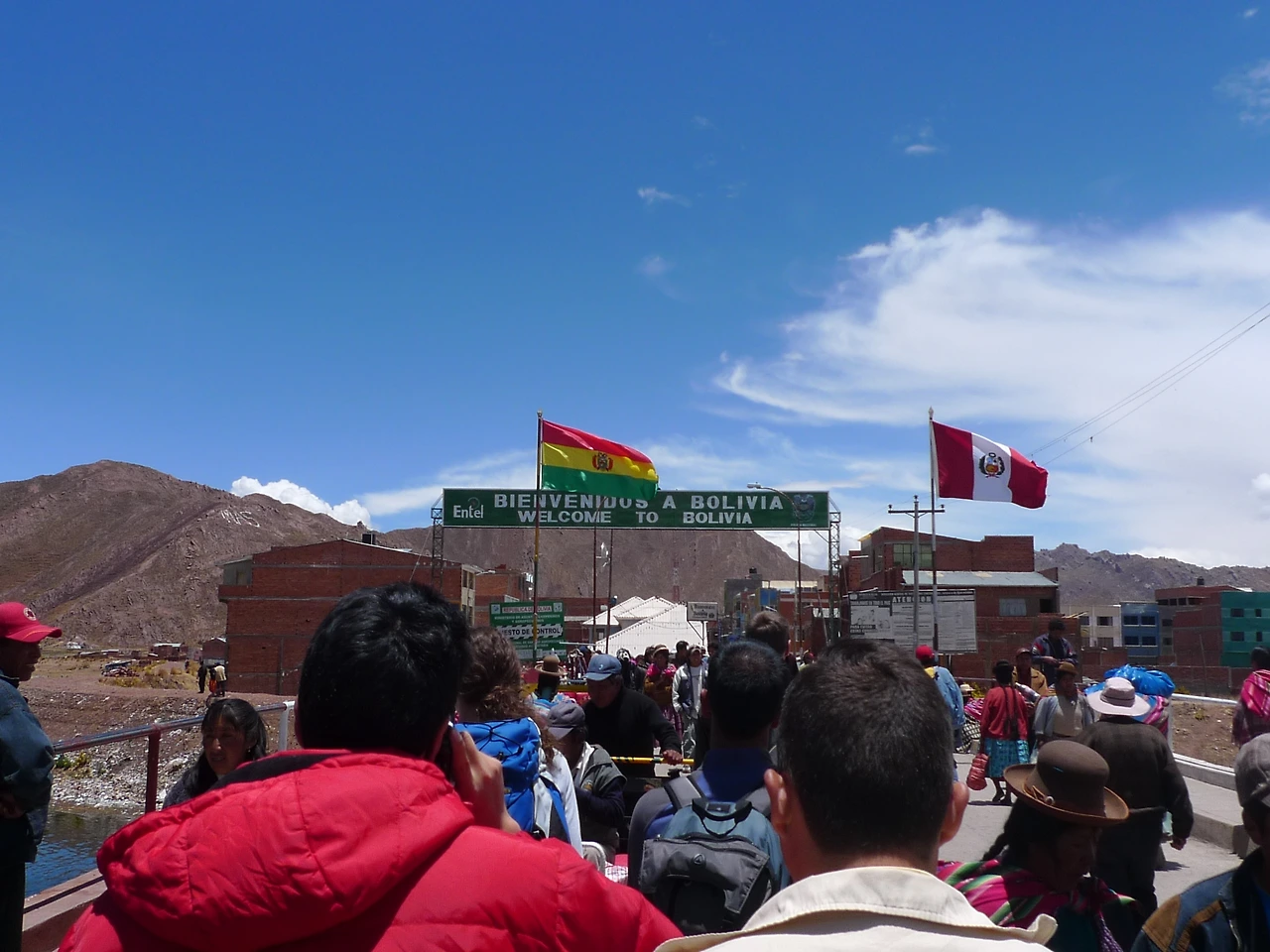 (Bienvenidos A Boliva. 영어로는 Welcome to Bolivia다. 노랑, 녹색이 있는 국기가 볼리비아 국기. 오른쪽이 페루 국기. 페루 국기 가운데를 자세히 들여다보면 알파카가 그려져 있다. 물론 농담이다)