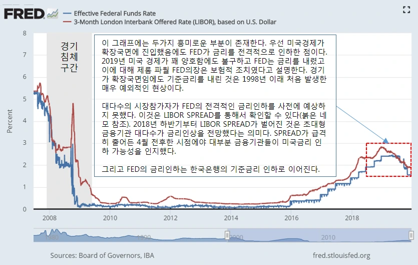 불과 몇 개월 전까지 미국 기준 금리 인하를 예상한 경제주체는 거의 없었다. 은행도 기업도 정부도 금리인하를 예상하지 못했다. 대다수의 시장 주체가 금리 인하를 예상하지 못한 상황에서 미국의 금리 인하는 예상치 못한 일격이었다. 그러나 불과 얼마 전까지만 해도 한미 금리 역전으로 골머리를 썩던 한국은행에는 희소식이었다. 한국은행의 총재는 싱글벙글 웃으면서 한국 기준금리를 내리겠다고 망치를 떵떵 내리쳤다.