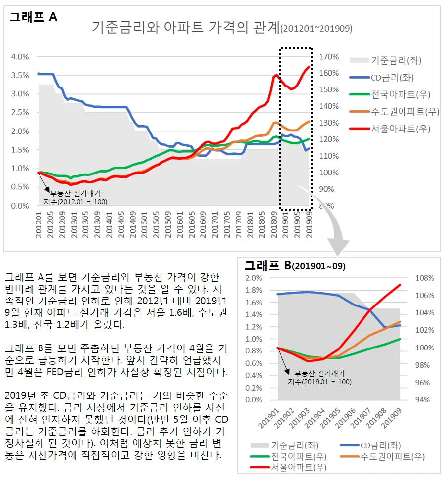 지난 한 해 부동산 가격이 오른 이유는 명확하다. 이 짧은 기간 인구구조와 주거행태에 어떤 변화가 있었을 리는 없다. 전국적 규모의 부동산 개발 호재가 발생했던 것이 아니며 부동산 공급량이 달라진 것도 아니다. 경기가 좋아진 것도 아니고 사람들의 소득 수준이 높아진 것도 아니다. 부동산 시장 전망은 최근 부동산 가격 변동의 후속 요인에 불과하다. 정부 정책은 시장에 중대한 영향을 준 적이 단 한 번도 없다. 그렇다. 앞서 열거한 모든 요소들은 이전과 비교하여 변화가 없었거나 영향력이 제한적인 것이다. 그러나 기준금리는 그렇지 않다. 직접적이고 강력하다. 기준금리가 역사상 최저점에 근접한 지점에서 예상치 못하게 추가로 인하된 것은 부동산 가격 상승에 직접적이고 심대한 영향을 미쳤다.