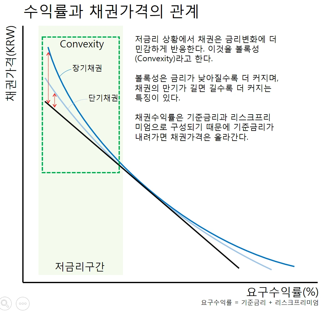 재무 수업을 들어본 사람이라면 채권의 가격결정 방식을 공부하면서 볼록성(Convexity)이라는 개념을 들어보았을 것이다. 채권의 가격과 금리의 관계는 직선적이지 않다. 이들의 관계는 언제나 약간의 볼록한 모양을 하고 있다. 이것이 볼록성이다. 금리에 따른 채권의 가격 변화를 계산하는 것은 컴퓨터가 할 일이다. 우리가 알아야 할 것은 볼록성이 채권 가격에 미치는 영향이다. 볼록성으로 인해 채권은 금리가 낮은 환경일수록 금리 변화에 더 민감하게 반응한다. 그리고 볼록성은 채권의 만기가 길어질수록 더 커진다. 즉 시중금리가 낮고 채권의 만기가 길어질수록 채권의 가격은 금리에 미칠 듯 민감하게 반응하는 것이다.