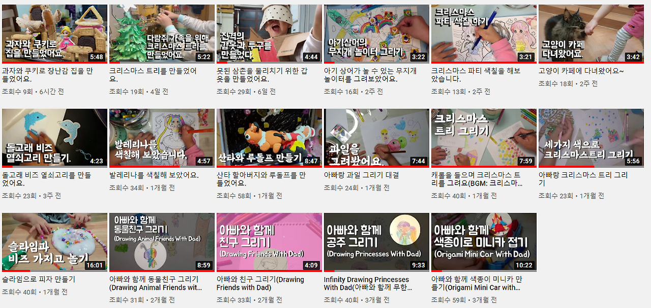 네 번째는 유튜브가 훌륭한 가족 앨범이 되어 주기 때문이다. 나는 유튜브에 아이의 얼굴이 나오지 않도록 하고 있다. 어차피 그림 그리고, 만들기 하는 것이 주요 콘텐츠이기 때문에 굳이 얼굴이 나올 필요도 없지만, 아이가 자라서 스스로가 원하기 전까지 아이 얼굴이나 신상을 함부로 공개해서는 안된다고 생각한다.