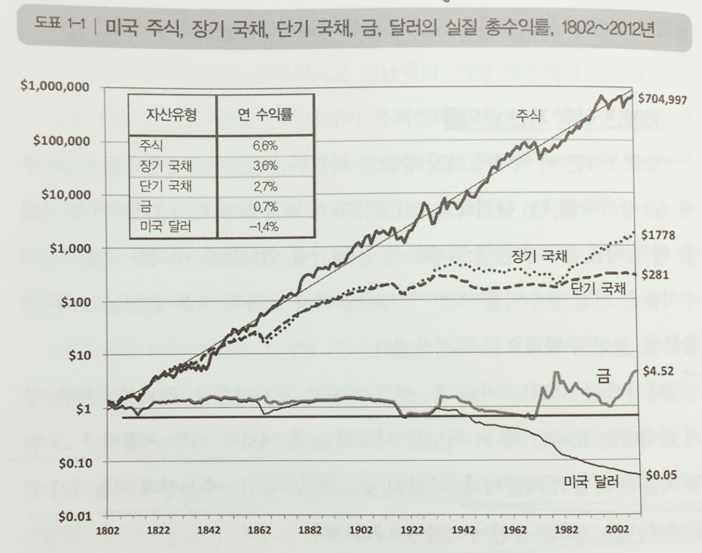 이 책에서 그는 주식과 장기 국채, 단기 국채, 금, 미국 달러의 수익률을 비교한다. 예를 들어 1802년에 1달러를 가지고 있던 사람이 이것을 각각의 투자 자산에 투자하였을때 장기 투자수익률이 어떻게 달라지는 지를 비교해 보면 결과는 주식의 압도적인 승리로 끝난다. 주식으로 $704,997을 실질가치를 벌어들이는 동안 현금을 가지고 있던 사람들은 $0.05의 실질가치만을 지켜낼 수 있었다. 인플레이션과 주식의 성장성이 이러한 차이를 만들어 낸 것이다. 이는 비단 미국에서만 통용되는 사례가 아니다. 대다수 선진국에서 동일한 현상이 발견된다.