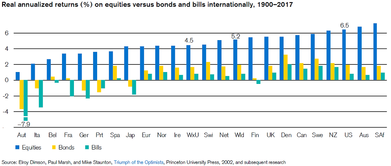 다른 선진국의 사례를 알고 싶다면 낙관론자의 승리라는 책을 찾아서 읽어보자. 혹은 Credit Suisse Global Investment Returns Year Book 2018을 찾아서보면 좀더 최근 자료를 상세하게 볼 수 있다. 아래는 주식과 장단기 채권을 비교한 수익률이다. 사례로 보여진 모든 선진국에서 주식의 투자수익률이 장단기 채권을 압도한다는 사실을 확인할 수 있다.