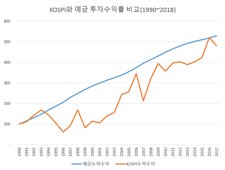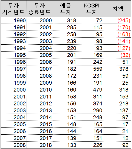 그렇지만 말이다. 한국은 조금 다르다. 한국이 1900~2003년까지 만들어낸 성장은 인류 역사상 전례가 없는 것이었다. 그렇다면 한국처럼 이례적인 국가에서 만들어진 주식의 수익률 또한 역사적으로 유례가 없을 정도로 어마무시한 것이 되어야 한다. 그런데 KOSPI가 3,000도 찍지못하는 지금의 현실을 보면 무언가 맞지 않는 것 같다. 찝찝한 마음에 나는 한국의 주식시장 수익률을 1990년부터 최근까지 비교해서 분석을 해보았다. 흠.. 한국은 역시 이례적이며 예외적인 국가인가? 28년이라는 충분히 긴 시계열에서 조차 예금의 수익률이 주식의 수익률을 앞서고 있었다. 주식의 배당수익까지 싹싹 긁어 모아 비교해도 KOSPI는 예금보다 수익률이 낮다. KOSPI가 가진 저 변동성을 생각하면 이것은 말이 되지를 않는다.