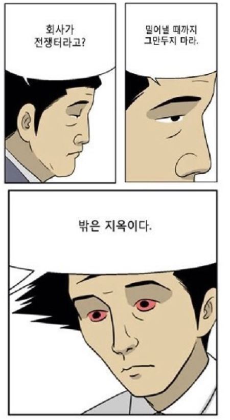 미생에 나오는 아주 유명한 대사가 있다. 회사는 전쟁터고 밖은 지옥이라는 대사다. 이 말을 하는 사람은 온갖 가오를 다 잡으면서 이야기 하고 야근으로 눈이 빨간 오상식 과장은 숙연한 표정으로 이 말을 듣고 있다.