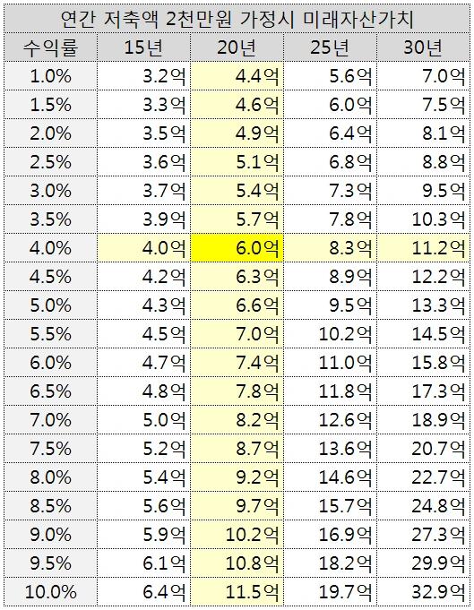 아래의 표는 수익률과 투자기간에 따라 미래자산 가치를 추정할 수 있는 표다. 만약 연간 저축액이 4천만원인 사람이라면 아래 표의 미래가치에 2를 곱하면 된다. 앞으로 20년 동안 매년 2천만원을 저축하고 그 기간동안 수익률 4%를 달성한다면 미래자산가치는 6억원 정도가 된다. 수익률이나 투자기간 가정에 따라 다르겠지만 많은 사람들이 3~6억원 정도의 미래자산가치 범위에 속할 것이다. 그리고 6억원을 가진 사람은 어떤 기준으로도 부자로 분류되기는 어렵다.