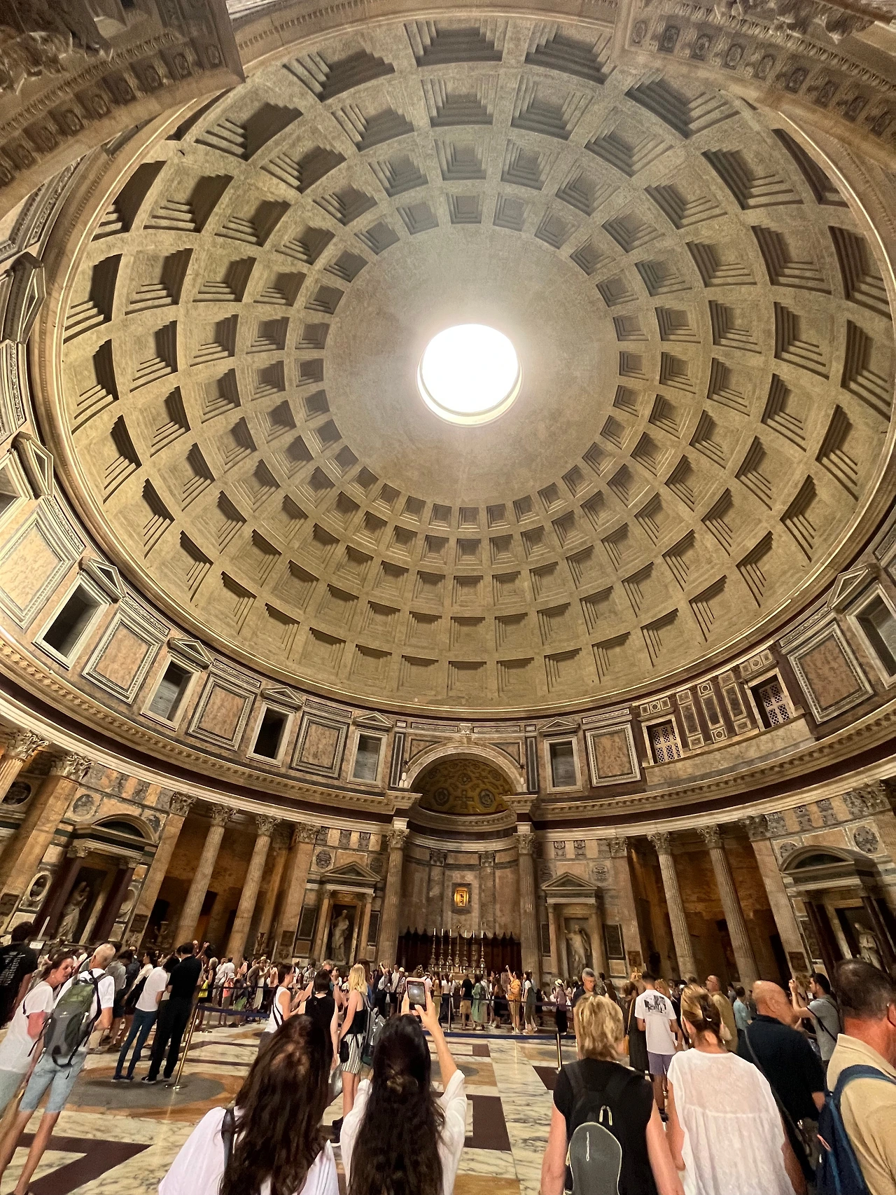 건축사적 의미는 차치하고서라도 판테온 앞에 섰을 때 가장 압도되는 것은 그 규모다. 로마의 많은 유적이 규모면에서는 사실 어떤 것도 상상 그 이상이지만 이 엄청난 규모의 고건축물이 너무나 완전한 형태로 위용을 뽐내고 선 모습에는 절로 경외감 같은 게 들었다. 층고는 결코 작지 않은데 돔이 주는 공간감 때문인지 거대한 반구형 아이맥스 영화관에 들어와 있는 것 같았다. 또한 금박도 그림도 없이 단순하고 반복적인 장식의 돔은 천정의 구멍으로 들어오는 햇살만으로도 충분히 화려하고 장엄했다. 그림과 조각, 화려한 장식이 가득한 여타 성당의 천정을 먼저 보고 왔다면 아름다움이라는 건 결코 더해짐으로만 얻어지는 건 아니라는 말이 더 와닿지 않았을까 싶었다.