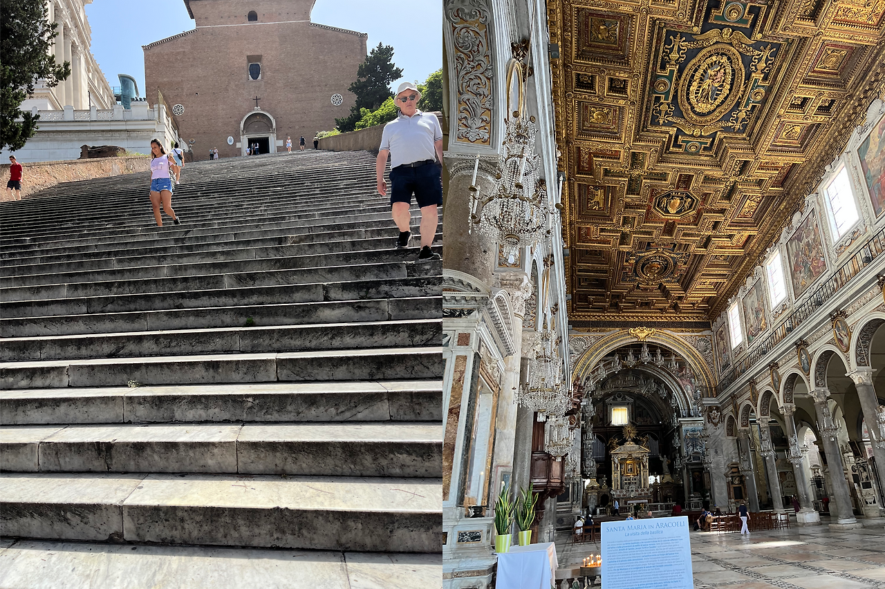 카피톨리노 언덕은 로마의 7개의 언덕 중 가장 높은 언덕이고 고대 로마의 상징과 같은 곳이다. 우리는 사실 캄피톨리노 뮤지엄에서 판매하는 버스 패스를 사기 위해 왔다가 엉뚱하게 그 옆 계단으로 올라가 산타마리아 인 아라코엘리 성당에 가게 되었다. ‘하늘 위의 성당’이라는 별칭답게 좁고 가파른 계단을 꾸역꾸역 올라가면 만나게 되는 성당은 겉모습은 소박한데 많은 성당이 그러하듯이 내부는 눈이 부실만큼 금빛 찬란하다. 처음에는 그 화려함에 입이 딱 벌어졌던 딸램도 어째 점점 여기도 금이네, 땡?! 인 분위기? 올라가서야 이 산이 아닌 걸 알게 된 고로, 성당 한번 둘러보고 다시 내려가 그 옆의 카피톨리노 뮤지엄 쪽 계단으로 다시 올라갔다. 미켈란젤로가 새롭게 레노베잇 한 광장은 건물의 배치 등 광장 자체만으로도 아름답고(진정 이 아름다움을 느끼려면 건축학적 지식이 약간이나마 필요함, 본인은 없었기에 못 느껴서 강조함) 뮤지엄 외에도 아우렐리우스 황제의 기마상(원본은 뮤지엄 내부에 전시) 등 볼거리가 풍부해 관광객이 많다.