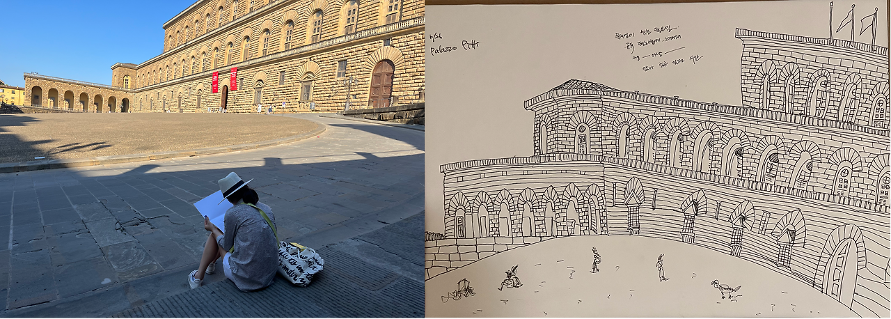피티 궁전 앞 그늘에 자리를 잡고 앉았다. 피티 궁전은 비례와 균형을 중시하는 전형적인 르네상스 양식으로, 장식은 배제하고 아치의 반복으로 리듬감을 만들어 낸 것이 특징이다. 워낙 화려한 건축물을 많이 봐서 그런지 궁전치고는 좀 소박하네? 싶었는데 그 단순한 반복이 보면 볼수록 세련되고 매혹적이다. 때로는 단순함이 웬만한 장식보다 화려하게 느껴지기도 한다. 잠시 쉬는 동안 이 매력적인 건축물을 스케치로 남겼다.