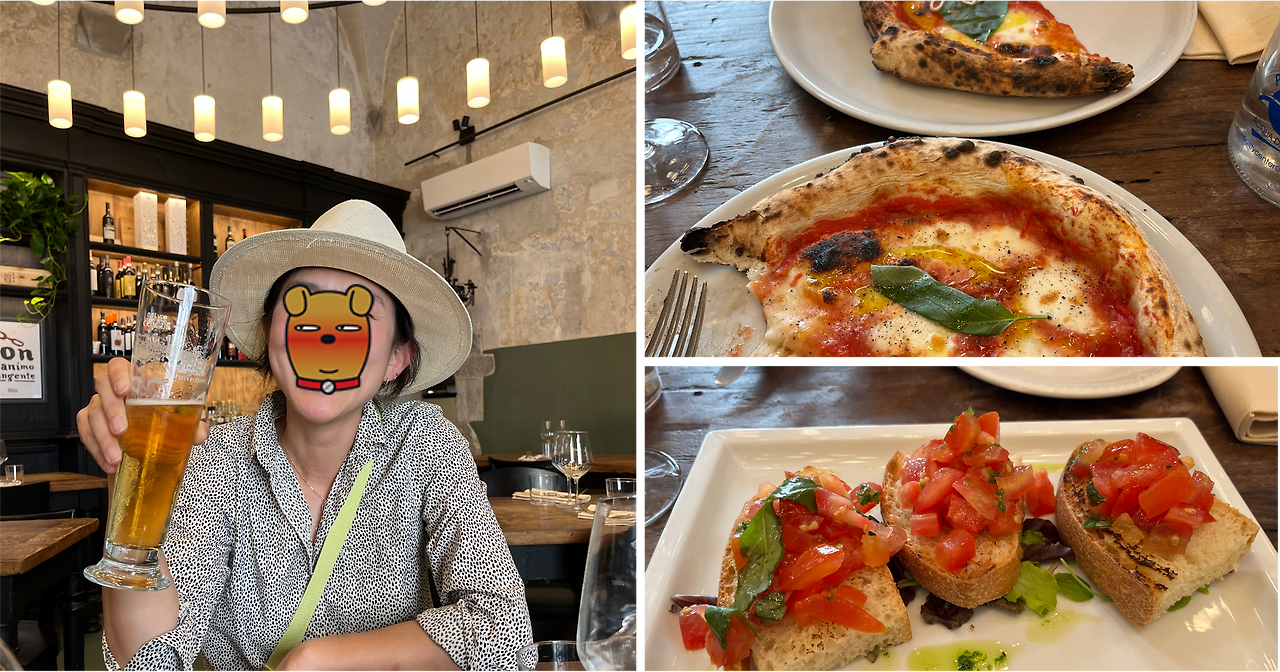 날씨가 더워서 스피릿츠 대신 시원한 맥주가 땡겼는데 아니나 다를까 이탈리아 맥주잔이 냉동에 히야시 되어 나오길 기대한 건 아니었지만 그조차 좁고 작아서 두 모금 마시고 입맛을 다실 수밖에 없었어. 하지만 피자의 나라답게 피자의 도우는 퍽퍽한 미국의 그것과는 비교도 안되게 쫀득하고 브루스게타는 절대 실망시키지 않았지.