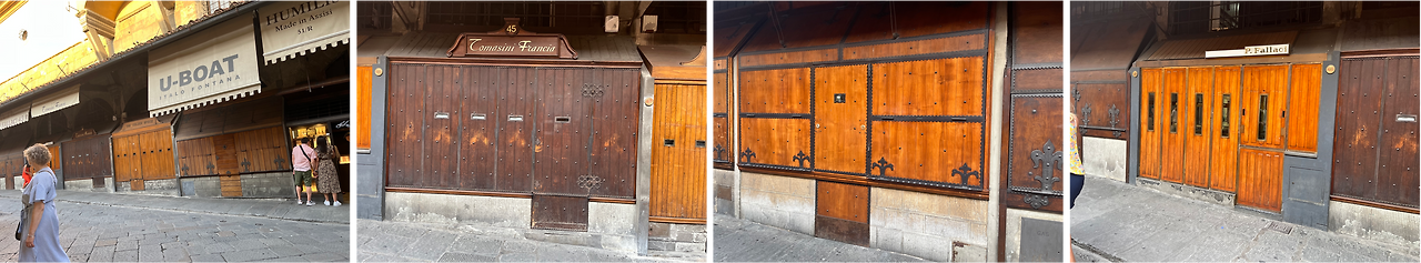 2. 베키오 다리에 늘어선 금은방들은 해가 지면 문을 닫는데 그 덮개 또한 두꺼운 나무 판에 금속 장식이 더해져 각각의 개성이 넘친다. 때문에 사람들이 북적거리는 대낮보다 상가가 문을 닫은 이후 석양이 드리워진 덮개길을 걸어보길 추천한다.