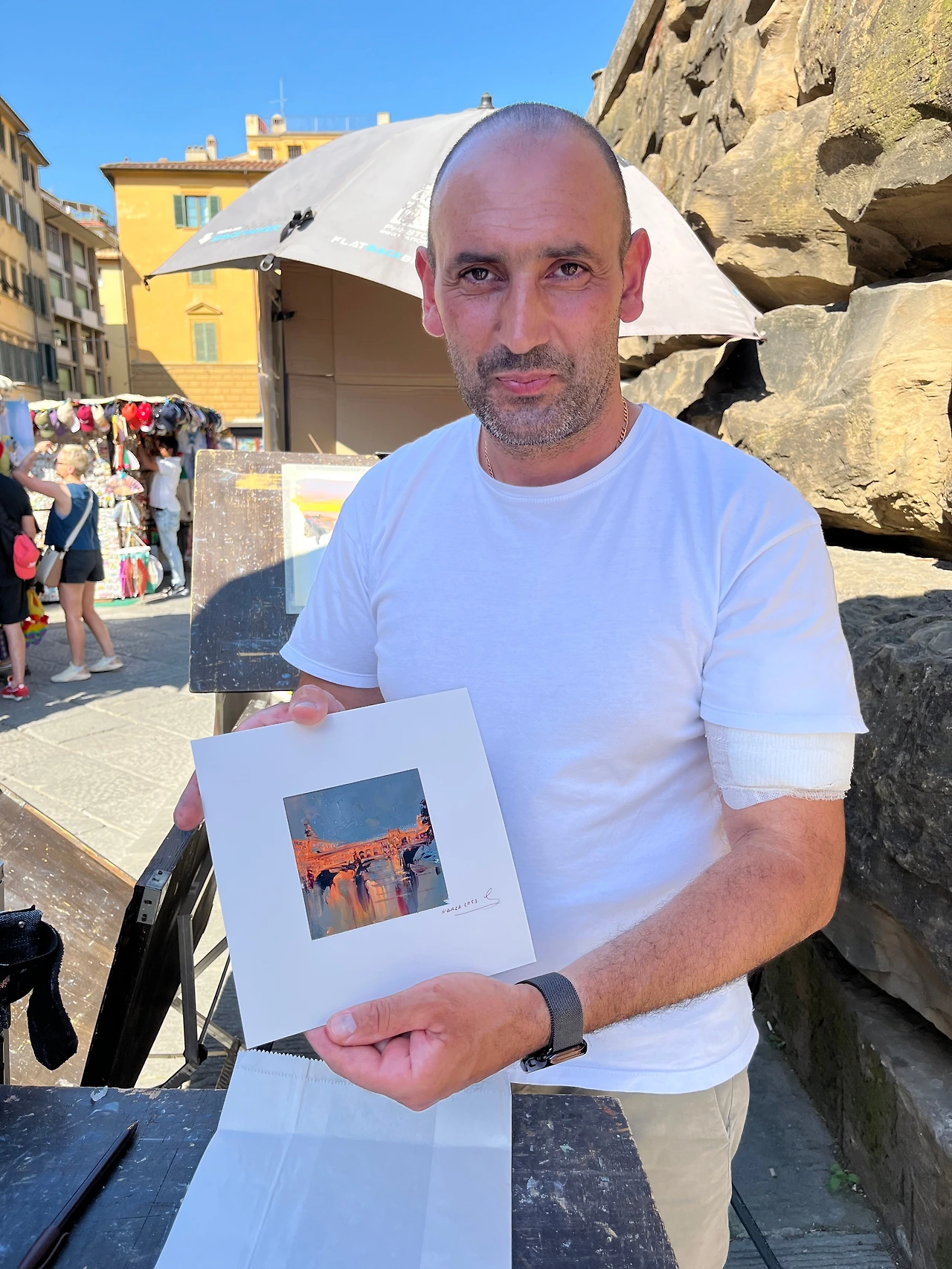 관광지라면 흔히 볼 수 있는 광경이지만 르네상스의 도시인만큼 이곳의 광장, 길에서 자리를 펴놓고 그림을 그리는 사람들은 진정한 무림고수처럼 보인다. 나이프만 사용해 유화 물감으로 베키오 다리를 그리는 아저씨가 있었는데 거침없는 나이프질도, 색감도, 텍스쳐도 독특해서 한참을 보고 있었다. 여행 중에는 멀 잘 안 사는 편인데 이거는 사야겠다 싶어서 물어보니 3인치 반정도 되는 젤 작은 게 25, 중간 사이즈는 180, 큰 거는 500유로? 그림 그리는 사람으로서 그림값 아까워하면 안 되는데 아… 이건 무리데쓰.