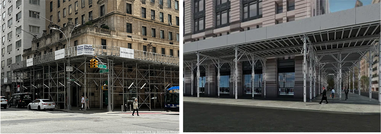 건물과 건물 사이 뻥뻥 뚫린 공간을 걷다 보니 떠오르는 모습이 있다. 뉴욕의 보행자 길에 설치된 철제 구조물이다. 철봉 기둥에 합판을 깔고 천막을 쳐서 세운 가림막이라 처음에는 먼 공사 구간이 이래 많나 했는데 알고 보니 오래전 건물 외벽에서 떨어진 장식에 보행자가 사망한 사고 이후, 보행자 보호를 위해 건물 외벽에 필수적으로 설치하도록 시에서 지정한 구조물이다. 임시 구조물 같지 않게 나름대로 깔끔하게 정돈해 둔 건물도 있지만 대부분은 이제 막 철수할 예정인 것처럼 얼기설기 노출되어 사정을 알고 봐도 흉물스러운 건 어쩔 수 없다.
