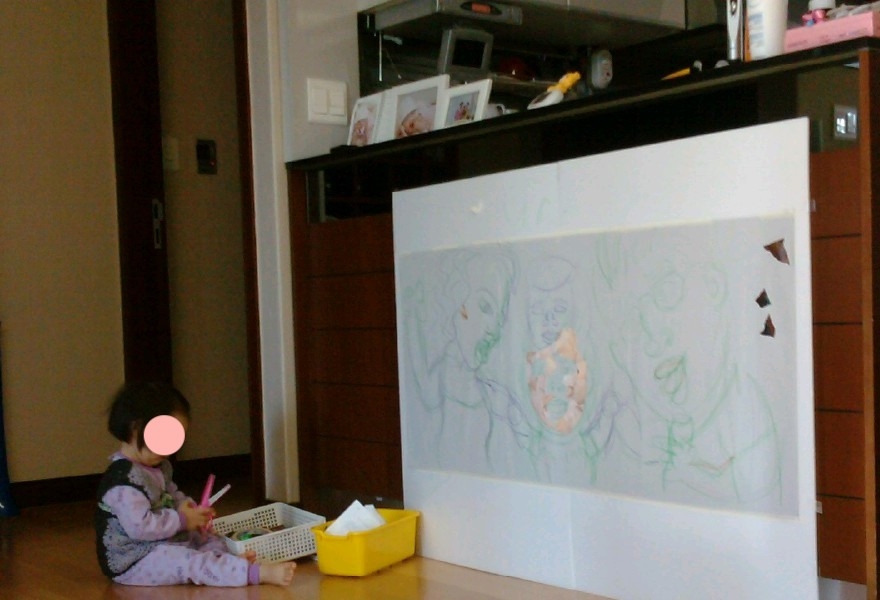 어쨌거나 그리하여 우리 집에서 가장 넓은 공간인 부엌 싱크 반대편 벽에 커다란 전지를 붙이고 아무렇게나 생각나는 밑그림을 그렸다.