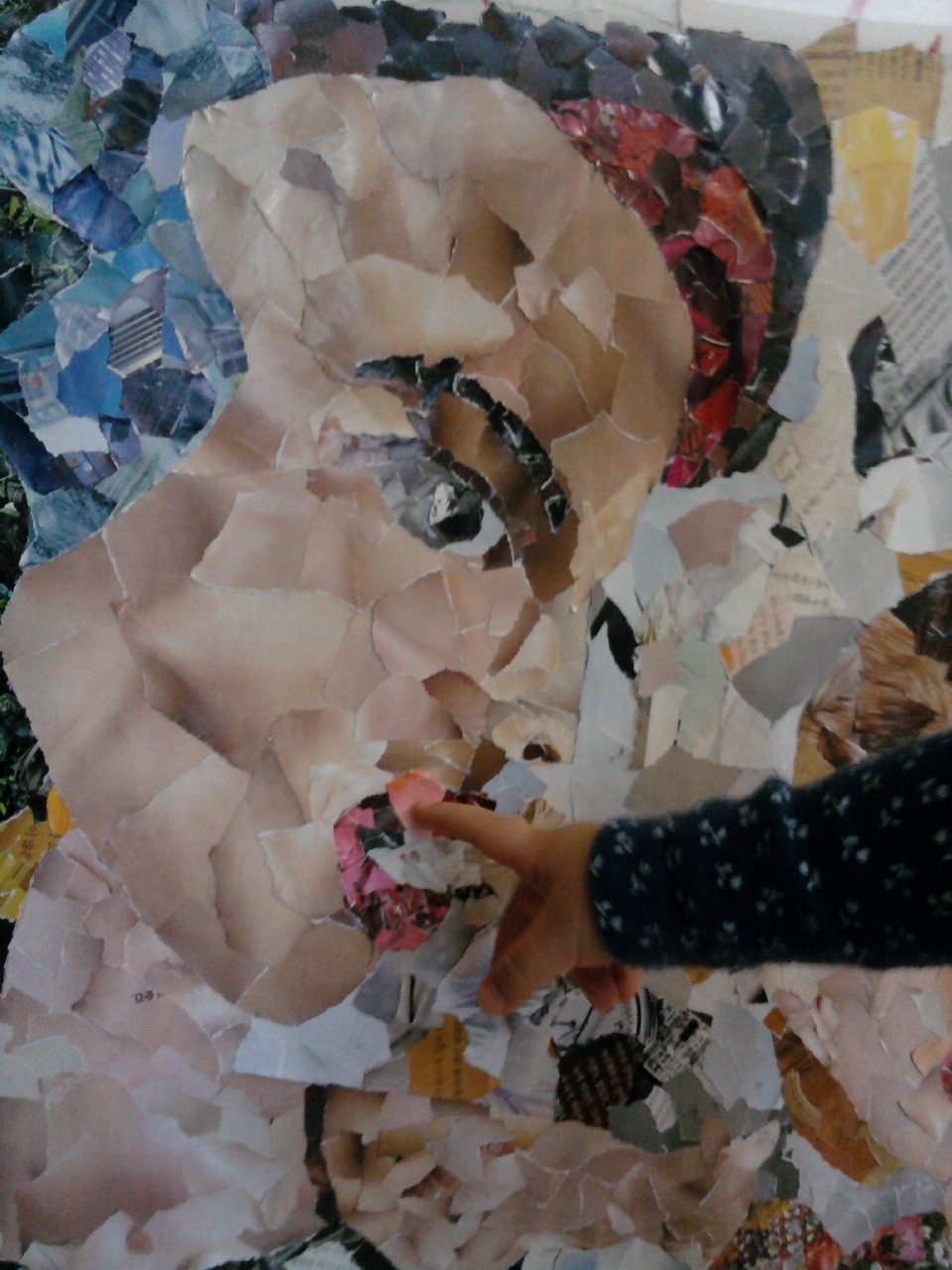 시댁에 가면 늘 쌓여있는 잡지를 가져다가 색깔별로 찢어 붙이는 꼴라쥬를 시작했다. 물론 곤쥬는 그림을 완성하는 것 따위에는 관심이 없다. 그저 풀칠해 벽에 붙이는 게 재미있었을 뿐, 당연히 그림에 맞춰 붙일 턱이 없이 아무 데나 붙였고 그나마도 채 10개도 붙이기 전에 싫증을 냈다. 곤쥬가 자는 시간, 같이 노는 시간 짬짬이 그림을 완성해 나가는 건 온전히 나의 몫이었으니 말 그대로 엄마를 위한 엄마에 의한 엄마의 공작교실이 아닌가.